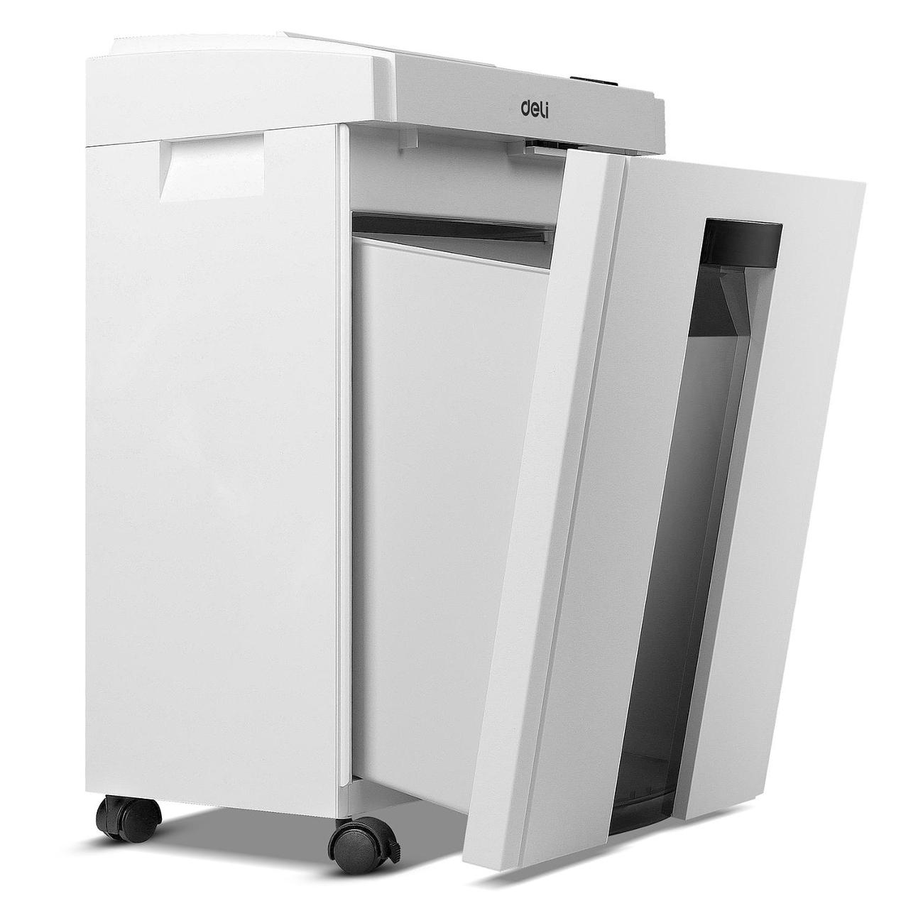 Шредер Deli E9952 — модель в корпусе из пластика, оснащенная колесами, обеспечивающими маневренность. Подходит для уничтожения разных документов со скрепками, скобами и пластиковыми картами. Уровень шума во время функционирования не превышает 60 дБ.