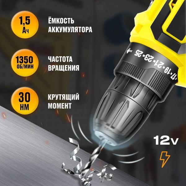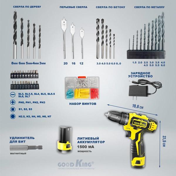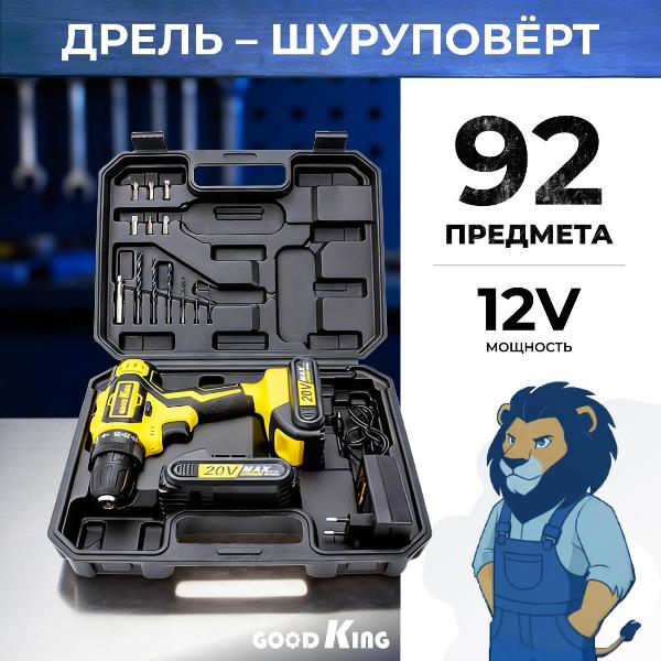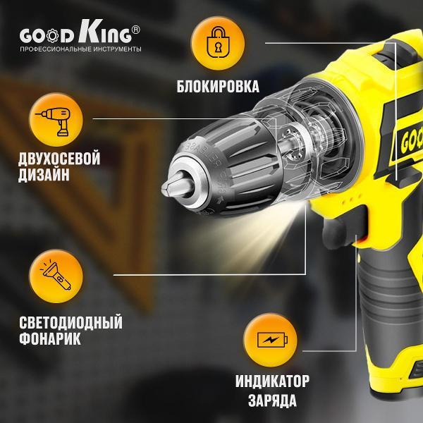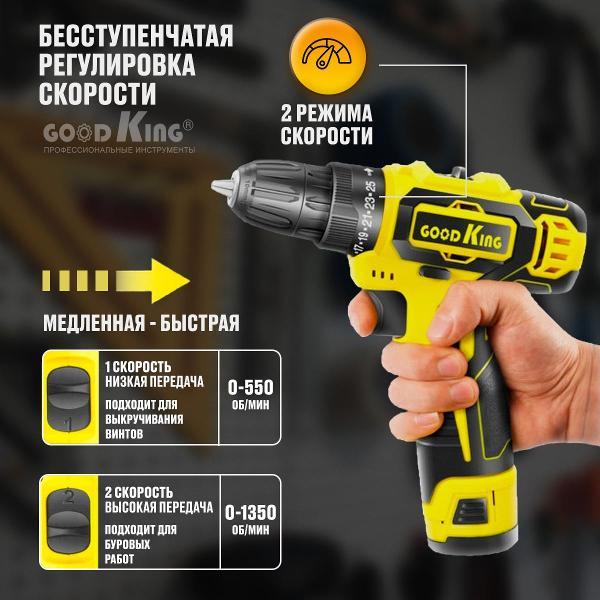 Аккумуляторная дрель-шуроповерт Goodking EC-1201092 совершает до 1350 об/мин. Режимов два: сверление и завинчивание (работа с шурупами диаметром до 7 мм). Дрель способна проделывать отверстия в дереве (до 20 мм) и металле (до 8 мм). Инструмент бытового класса, будет полезен в ремонте и строительстве. Максимальный крутящий момент — 20 Н.м.