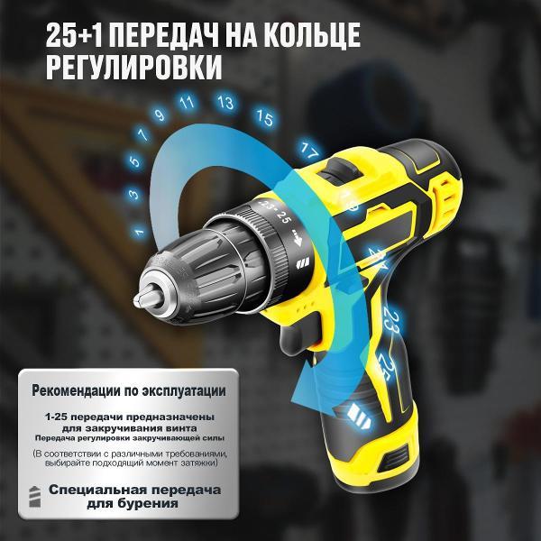 Встроен фонарик, который облегчит работу в местах с недостаточной освещенностью. Функция «Реверс» позволит переключаться между прямым и обратным вращением, «Блок» — блокирует работу инструмента. Быстрозажимной патрон упрощает смену оснастки. Максимальный диаметр патрона — 10 мм.