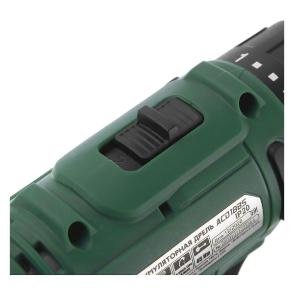 Модель включает в себя быстрозажимной патрон диаметром 10 мм, лампу точечной подсветки, прорезиненную рукоятку. Питание инструмента осуществляется при помощи литий-ионного аккумулятора емкостью 2 А*ч. Напряжение аккумулятора составляет 18 В, время заряда — 60 мин. Дополнительно к дрели прилагается кейс, зарядное устройство и дополнительный аккумулятор.