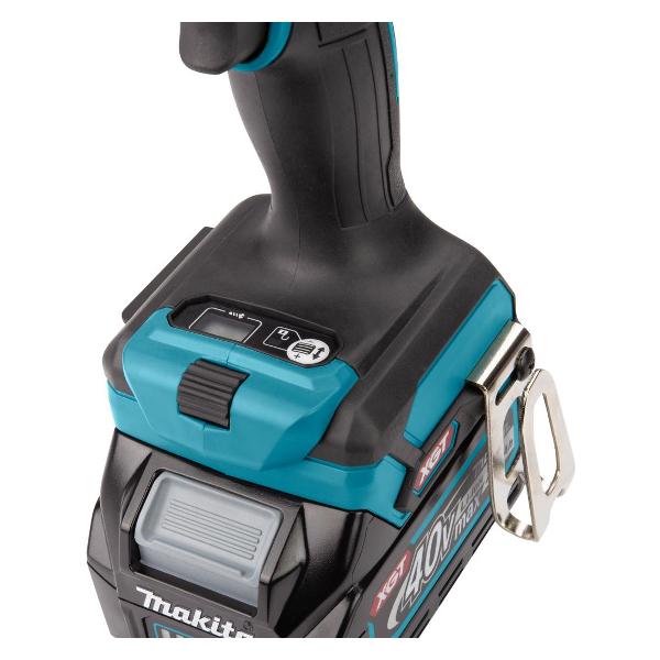 Корпус произведен из металла и пластика. В конструкции пистолетного типа предусмотрен ограничитель глубины. Модель оборудована лампой для яркой точечной подсветки, что гарантирует хорошую видимость окружающего пространства. В качестве источника питания используется съемный литий-ионный аккумулятор емкостью 2,5 А*ч и напряжением — 40 В. В комплект входит кейс для удобного хранения и транспортировки.