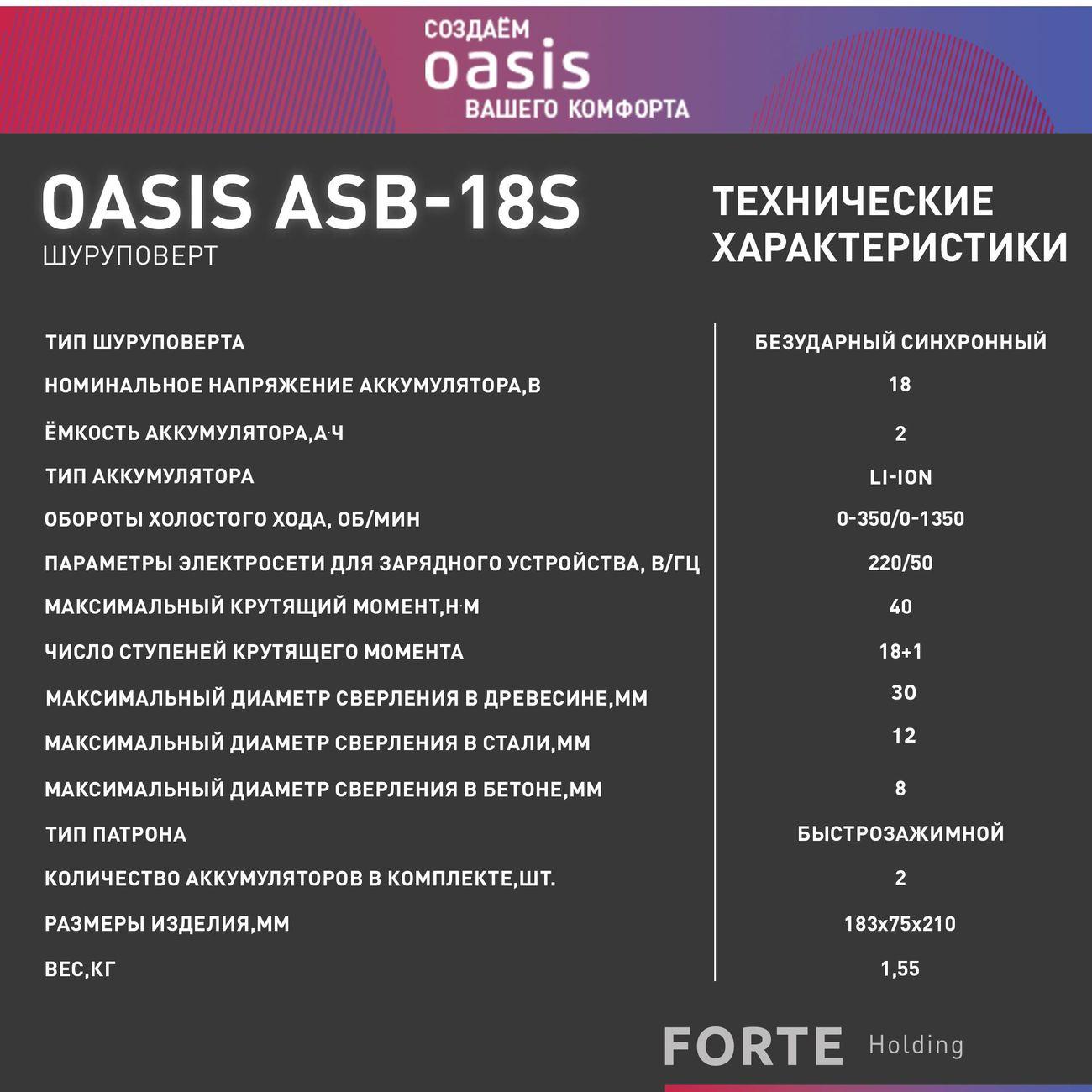 Аккумуляторный шуруповёрт Oasis ASB-18S предназначен для работы с деревом, металлом, пластиком и любыми крепежами. Он отлично справляется как с домашними, так и с профессиональными задачами. Номинальное напряжение инструмента составляет 18 В.