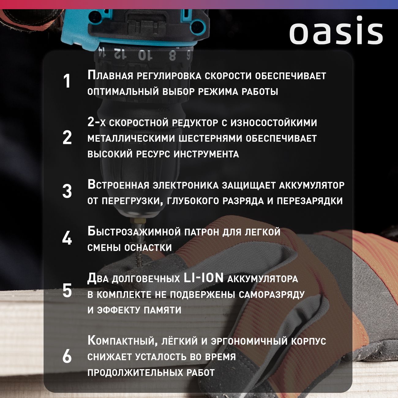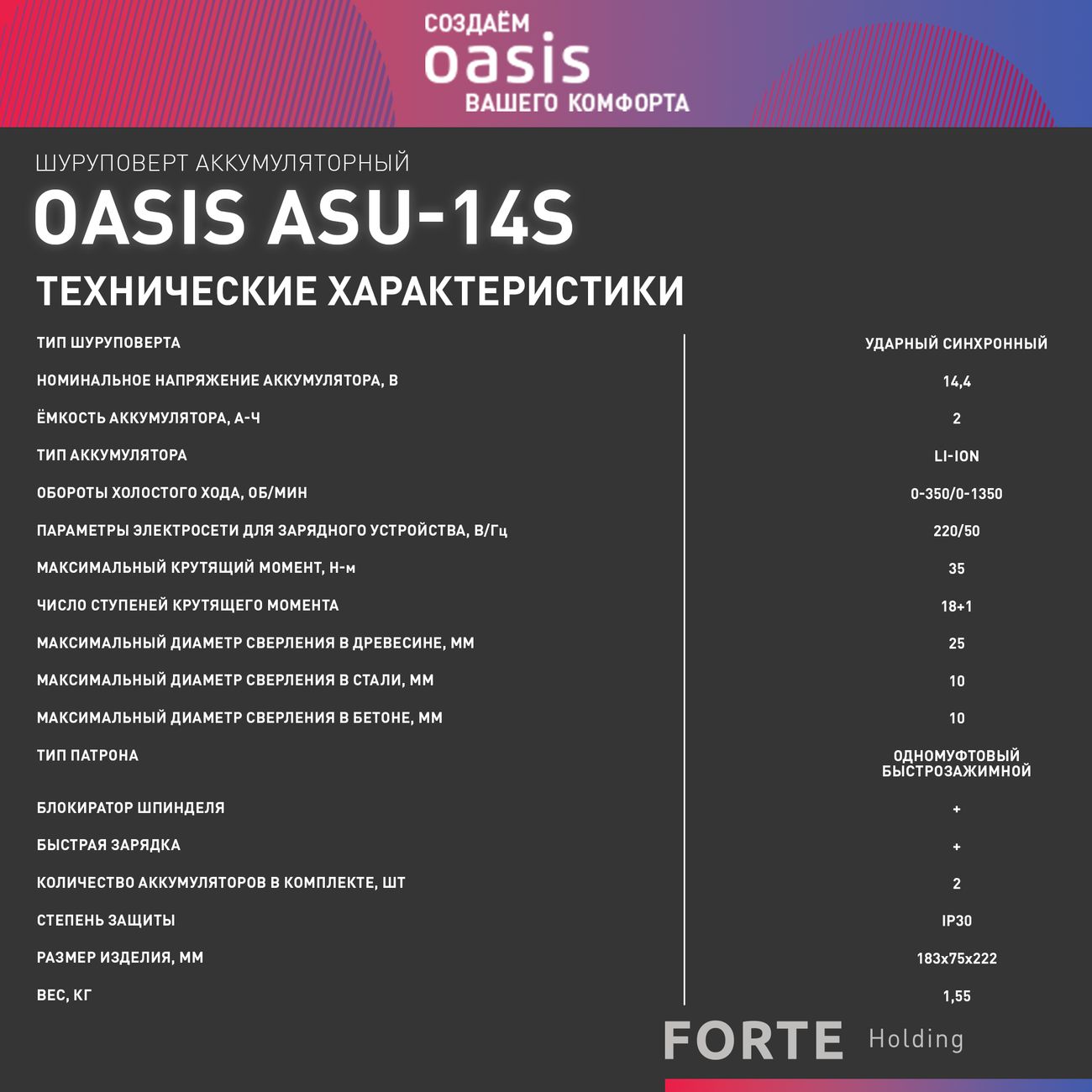 Вы можете купить Шуруповерт аккумуляторный Oasis ASU-14S в магазинах М.Видео по доступной цене. Шуруповерт аккумуляторный Oasis ASU-14S: подробное описание, фото и отзывы реальных покупателей, характеристики, возможность скачать инструкции и подобрать аксессуары.