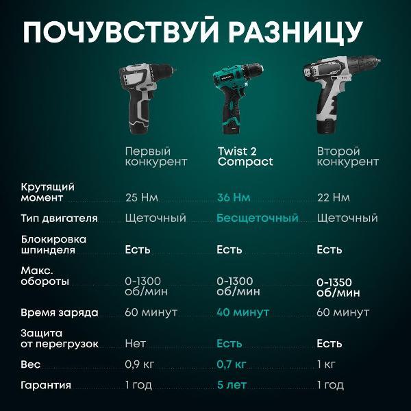 Вы можете купить Шуруповерт аккумуляторный Rokodil Twist 2 Compact в магазинах М.Видео по доступной цене. Шуруповерт аккумуляторный Rokodil Twist 2 Compact: подробное описание, фото и отзывы реальных покупателей, характеристики, возможность скачать инструкции и подобрать аксессуары.