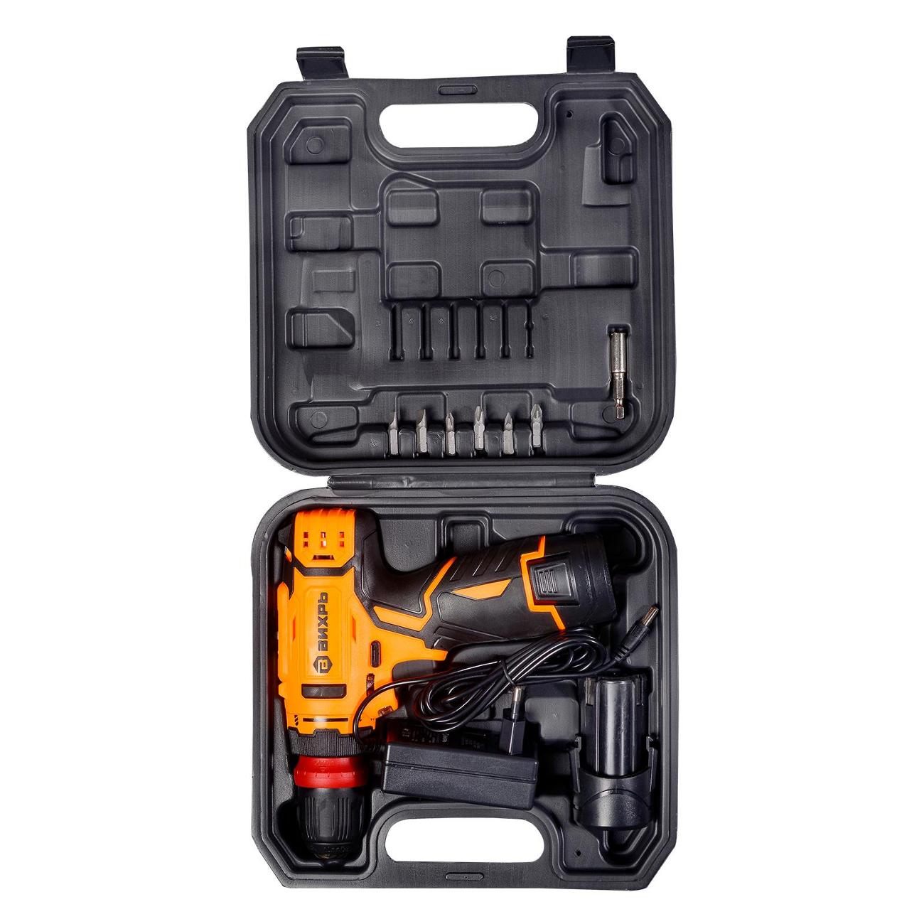 Аккумуляторная дрель «Вихрь» ДА-12Л-2КC с двигателем щеточного типа и возможностью торможения совершает 1400 об/мин (возможно регулировать). Скорость редуктора — 400 об/мин. Наибольший диаметр сверления по металлу составляет 10 мм, по дереву — 20 мм. Встроена подсветка рабочей зоны, реверс. Патрон размером 10 мм бесключевой быстрозажимной.