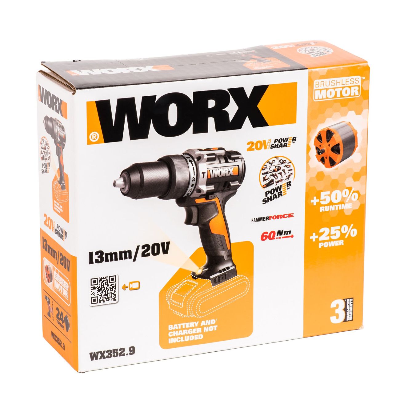 Аккумуляторная дрель бытового класса Worx WX352 оснащена двигателем, обеспечивающим до 2000 оборотов в минуту. Максимальный крутящий момент — 60 Нм, доступны 22 ступеней и одна дополнительная плюс две рабочие скорости. Инструмент подходит для сверления и закручивания шурупов, у него есть функция реверса.