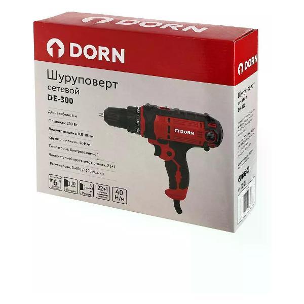 Дрель-шуруповерт DORN выполнена из прочного пластика и применяется для завинчивания и отвинчивания шурупов, саморезов и болтов.Преимущества и особенности:Быстрая и легкая замена оснастки за счет быстрозажимного патрона.Двухступенчатая регулировка: низкое или высокое число оборотов, при этом скорость вращения зависит от силы нажатия на клавишу пуска.Кнопка блокировки клавиши пуска для продолжительных работ.Удобная рукоятка с антискользящей накладкой обеспечивает крепкий и надежный хват.При покупке через интернет-магазин форма корпуса шуруповерта может отличаться от представленной на фото, поставка зависит от наличия товара на складе.Сетевая дрель-шуруповерт предназначена для закручивания крепежных элементов и сверления в дереве, металле, кирпиче и камне.Тип : Дрели-шуруповерты. Марка : DORN. Питание : От сети. Мощность (Вт) : 300. Крутящий момент (Н/м) : 40. Max диаметр сверления в дереве (мм) : 25. Max диаметр сверления в металле (мм) : 10. Max диаметр сверла в патроне (мм) : 10. Встроенная подсветка : Нет. Тип патрона : Быстрозажимной. Диаметр патрона (мм) : 10. Число скоростей : 2. Тип двигателя : Щеточный. Наличие удара : Нет. Тип удара : Без удара. Число оборотов (об/мин) : 0-400/0-1400. Число ступеней крутящего момента : 23+1. Наличие реверса : Да. Длина кабеля (м) : 6. Страна производства : Китай. Гарантия производителя : 2 года.