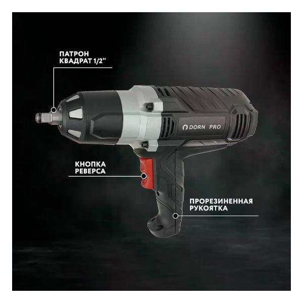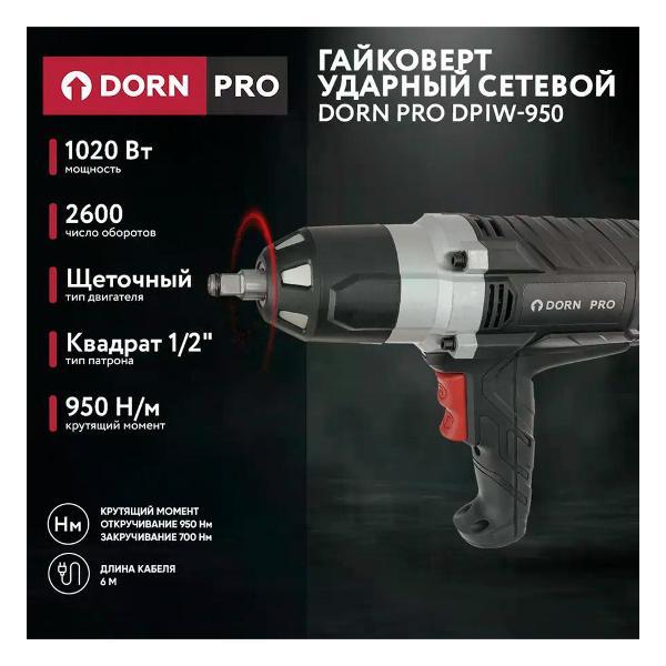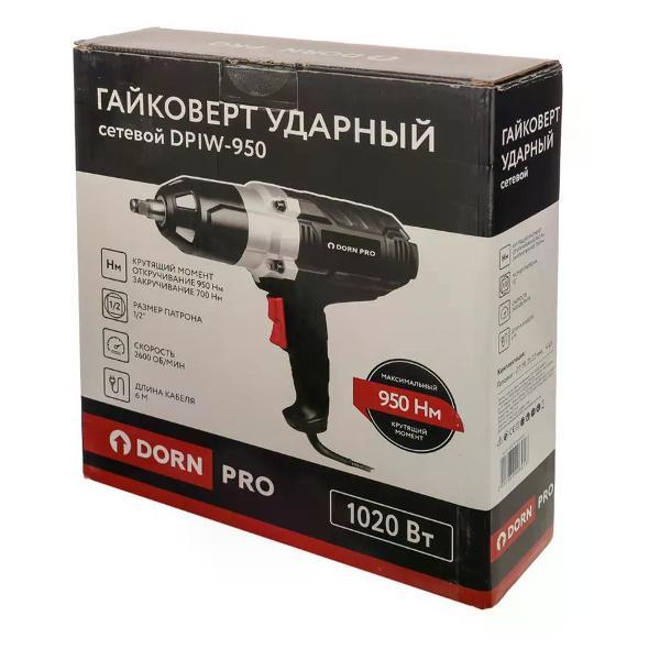 Гайковерт ударный DORN PRO DPIW-950 применяется для закручивания крепежа.Особенности и преимущества:- скорость вращения регулируется усилием нажатия на клавишу пуска; эргономичная обрезиненная рукоятка для надежного хвата; легкий доступ к угольным щеткам; резиновый износоустойчивый морозостойкий кабель.. Тип: Гайковерты; Бренд: DORN PRO; Питание: От сети; Мощность (Вт): 1020; Крутящий момент (Н/м): 950; Встроенная подсветка: Нет; Тип патрона: Квадрат 1/2"; Тип двигателя: Щеточный; Наличие удара: Да; Тип удара: Тангенциальный; Число оборотов (об/мин): 2600; Наличие реверса: Да; Длина кабеля (м): 6; Комплектация: Головки - 4 шт, инструкция, упаковка; Страна производства: Китай; Гарантия производителя: 3 года; Вес 5.2
