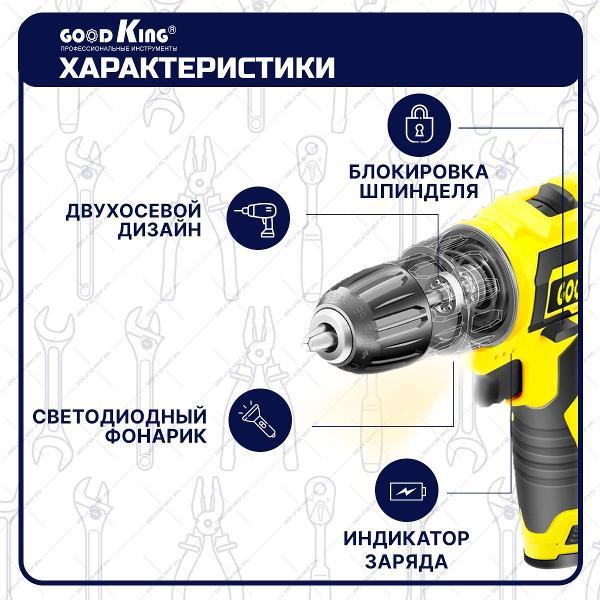 Шуруповерт Goodking YL-101201 применяется в профессиональных строительных и бытовых работах для сверления отверстий в различных материалах. Прибор работает с максимальным числом оборотов 1350 об/мин. Есть возможность регулировать количество. Оснащен LED-подсветкой рабочей зоны для эксплуатации в условиях недостаточного внешнего освещения. Скорость работы регулируется в 25 вариантах. Диаметр сверления — 10 мм. Питается от съемного аккумулятора мощностью 1,5 А*ч.