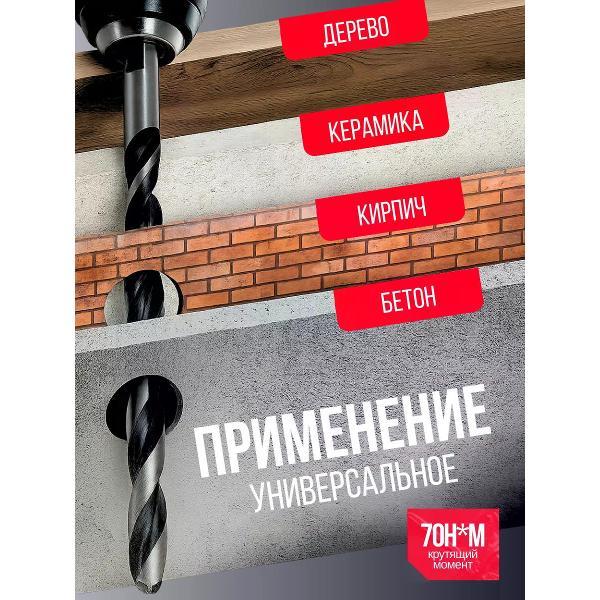 Шуруповерт аккумуляторный с 2 режимами от 500 до 1950 об/мин. Максимальный крутящий момент аккумуляторного шуруповерта для дома — 70 Нм.