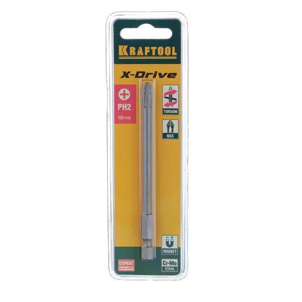 Бита для шуруповерта KRAFTOOL X-Drive PH2, 100 мм. Бита KRAFTOOL X-Drive предназначена для монтажа/демонтажа резьбовых соединений. Особенности и преимущества:- кованые биты изготовлены из высококачественной хромомолибденовой стали;- благодаря оптимальной геометрии обеспечивают высокую эффективность завинчивания;- система насечек NSS препятствует выскальзыванию шлица из крепежа во время работы;- торсионная зона специальной Х-формы смягчает ударные нагрузки и предотвращает разрушение наконечника;- биты обладают большим рабочим ресурсом и выдерживают высокие динамические нагрузки, поэтому рекомендуются для профессионального использования.. Вид насадки: PH2; Бренд: ; Длина (мм): 100; Магнитный наконечник: Нет; Подходит для ударных шуруповертов: Нет; Хвостовик: Шестигранный, 1/4"; Материал: Хромомолибденовая сталь; Страна производства: Тайвань; Вес : 0.04