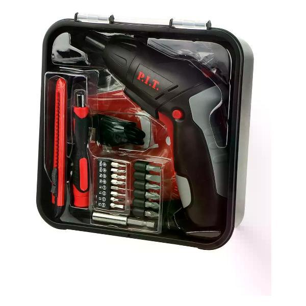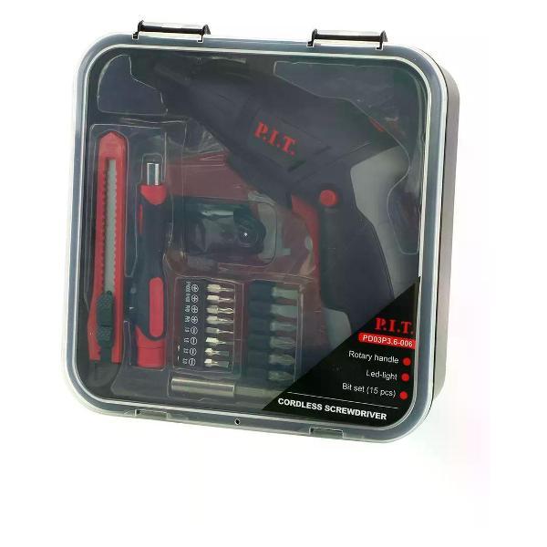 Отвертка аккумуляторная P.I.T. используется для закручивания и выкручивания крепежных элементов.Преимущества и особенности:Магнитный патрон надежно удерживает оснастку.Встроенная подсветка облегчает работу в плохо освещенных местах.Также инструмент дополнительно оснащен мощным фонариком, встроенным в рукоятку.Снабжен функцией реверса со световой индикацией.Поворотная рукоятка с прорезиненным покрытием обеспечивает удобный и надежный хват.Электроотвертка с подсветкой предназначена для закручивания и выкручивания шурупов, винтов, саморезов. Крутящий момент - 3,5 Н/м. В комплекте набор бит, магнитный держатель, отвертка-держатель, канцелярский нож и зарядный кабель.Тип : Отвертки аккумуляторные. Марка : P.I.T.. Питание : От аккумулятора. Напряжение (В) : 3.6. Крутящий момент (Н/м) : 3.5. Тип аккумулятора : Li-Ion. Количество аккумуляторов : 1. Ёмкость аккумулятора (А/ч) : 1.3. Встроенная подсветка : Да. Тип патрона : Внутренний шестигранник 1/4". Число скоростей : 1. Тип двигателя : Щеточный. Число оборотов (об/мин) : 0-180. Наличие реверса : Да. Комплектация : Магнитный держатель - 1 шт, отвертка-держатель - 1 шт, биты - 14 шт, канцелярский нож - 1 шт, USB-кабель - 1 шт, инструкция, кейс. Страна производства : Китай. Гарантия производителя : 1 год.