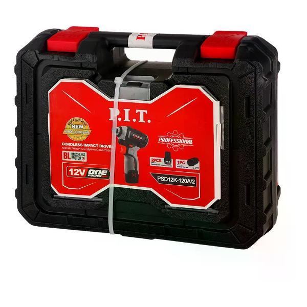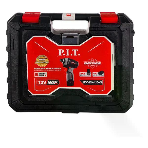 Аккумуляторный ударный винтоверт P.I.T. PSD12K-120A/2 используется для завинчивания и отвинчивания болтов, гаек, винтов и шурупов.Особенности и преимущества:- мощный бесщеточный двигатель;- большой крутящий момент для сложных работ;- реверс для изменения направления вращения;- кнопка быстрой смены режима для настройки силы удара;- электрической тормоз для безопасной эксплуатации;- режим автоматической остановки при откручивании;- изменение крутящего момента и количества оборотов при помощи специального переключателя на корпусе;- встроенная подсветка облегчает работу в плохо освещенных местах;- скорость вращения регулируется усилием нажатия на клавишу пуска;- прорезиненная накладка на рукоятке для надежного хвата.. Тип: Винтоверты; Бренд: P.I.T.; Питание: От аккумулятора; Напряжение (В): 12; Крутящий момент (Н/м): 120; Тип аккумулятора: Li-Ion; Количество аккумуляторов: 2; Ёмкость аккумулятора (А/ч): 2; Встроенная подсветка: Да; Тип патрона: Внутренний шестигранник 1/4"; Число скоростей: 3; Тип двигателя: Щеточный; Наличие удара: Да; Тип удара: Тангенциальный; Число оборотов (об/мин): 0-1100/0-2200/0-3300; Частота ударов (уд/мин): 0-4300; Наличие реверса: Да; Комплектация: Аккумулятор - 2 шт, зарядное устройство - 1 шт, бита ударная - 1 шт, инструкция, кейс; Страна производства: Китай; Гарантия производителя: 1 год; Вес 2.24