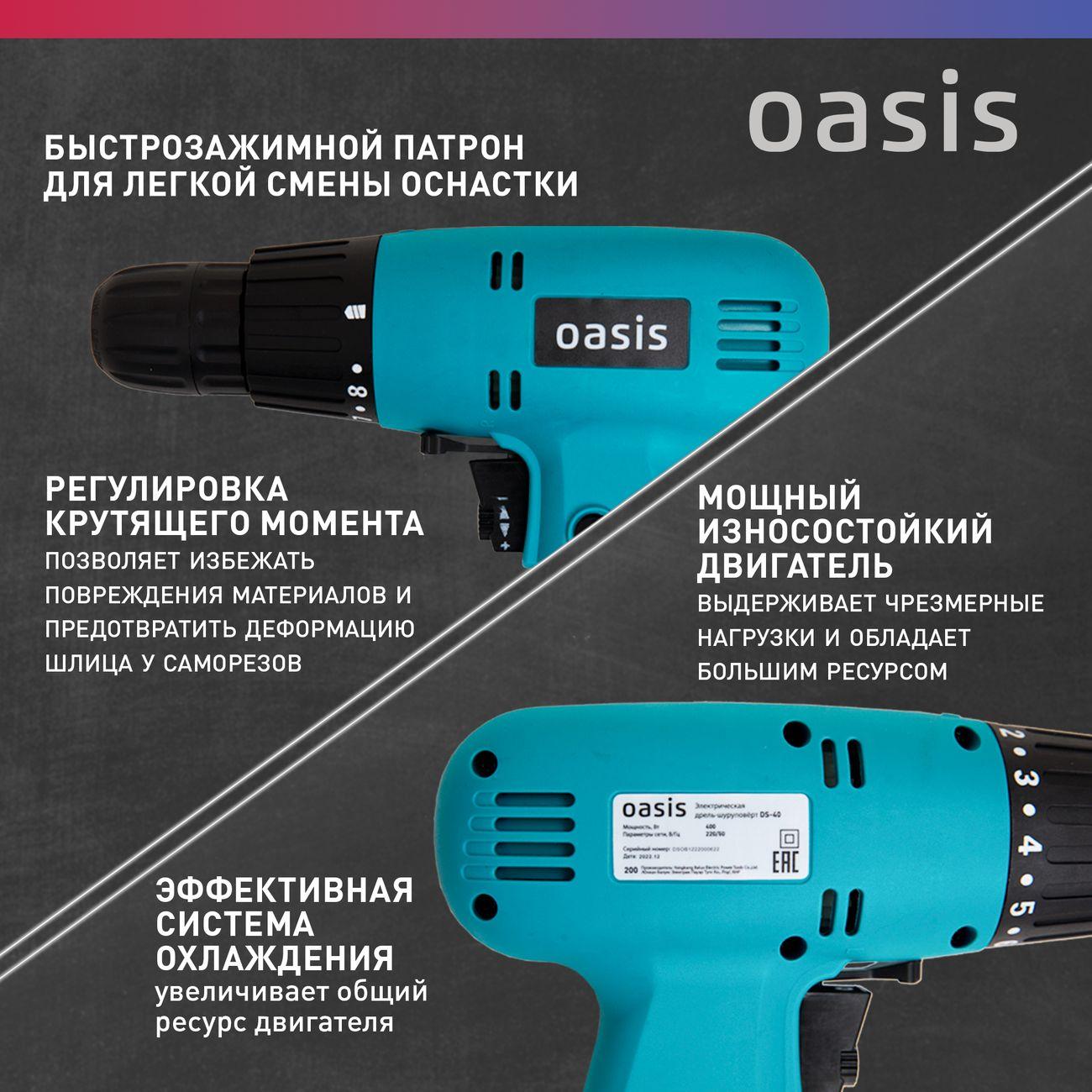 Электрическая дрель Oasis DS-40 в пластиковом корпусе красного цвета обладает мощностью 400 Вт. Модель предусматривает наличие быстрозажимного патрона с максимальным диаметром 10 мм. Встроенная опция «Реверс» позволяет выкручивать неправильно вкрученный элемент. Устройство оборудовано системой охлаждения. Максимальное число оборотов холостого хода составляет 800 об./мин.