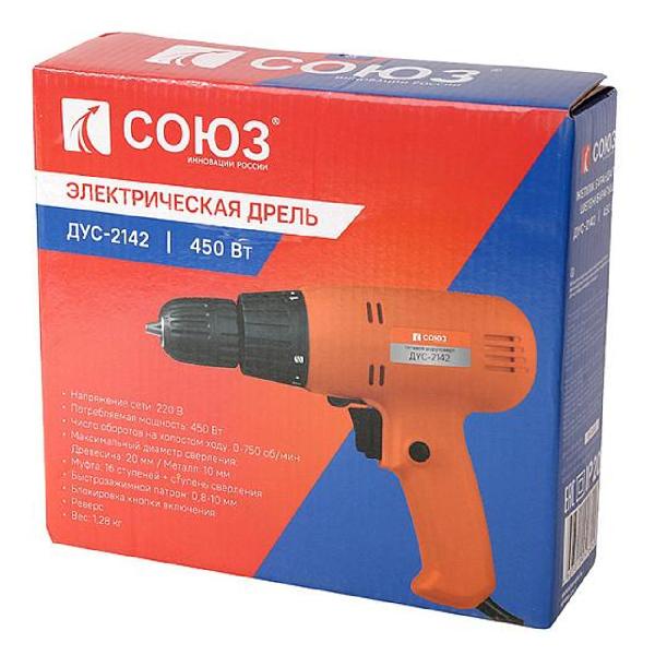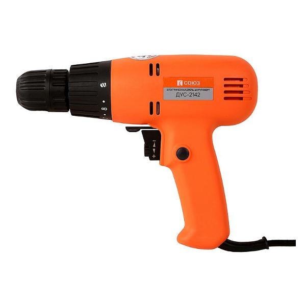 Шуруповерт Союз ДУС-2142 предназначен для сверления и заворачивания шурупов. Быстрозажимной патрон диаметром 0,8-10 мм. Потребляемая мощность — 450 Вт. Максимальная скорость редуктора — 750 об/мин. Максимальный крутящий момент — 14,5 Н.м.