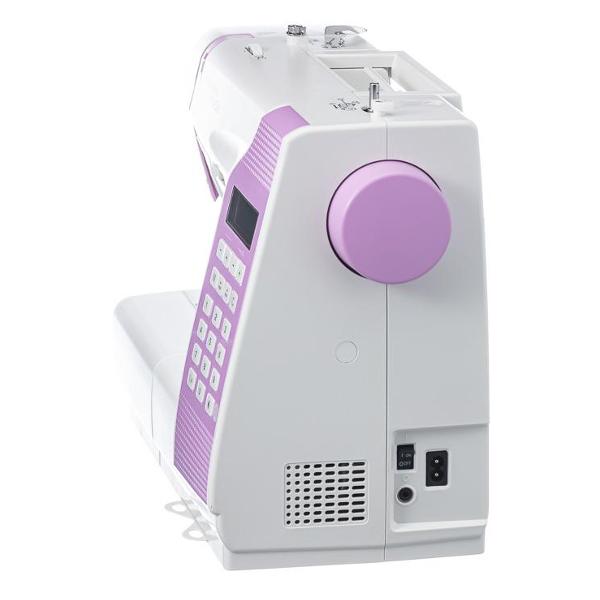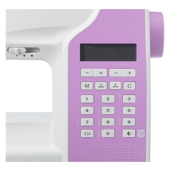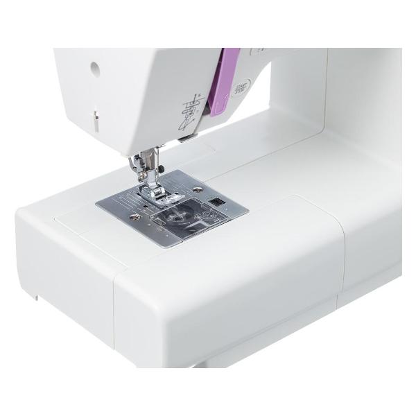 Устройство оборудовано мотором мощностью 70 Вт и семисегментной рейкой-транспортером. Предусмотрены направляющие линии шва. Функция «Реверс» активирует обратный ход для закрепления строчки. В комплект входят вспарыватель, набор игл, отвертка, щеточка для чистки, чехол для удобного хранения и переноски. Габаритные размеры швейной машины — 30х18х18 см, вес — 6,5 кг.
