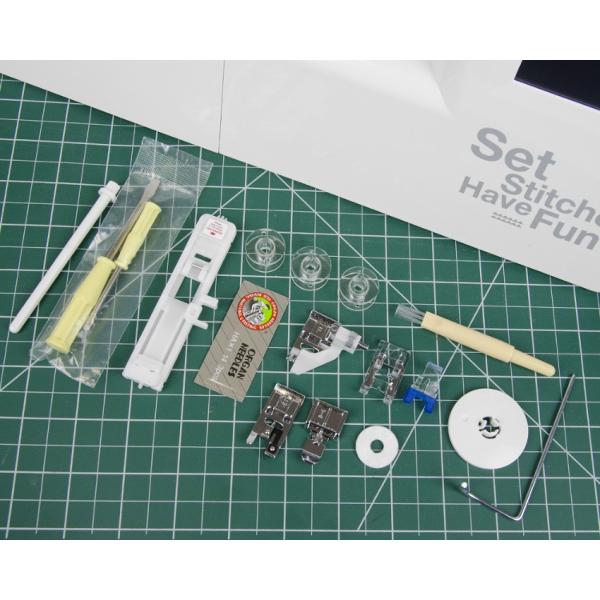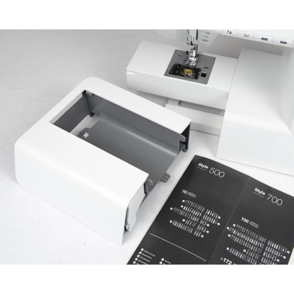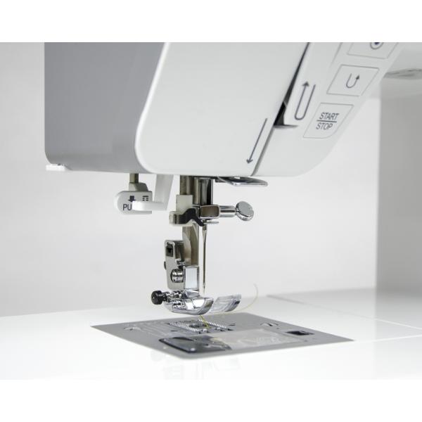 К сети 220-240 В электроприбор подключается шнуром длиной 6 м, что обеспечивает свободу движений и дает возможность размещать изделие в удобном месте. Предусмотрена электромеханическая намотка нитки на шпульку. Механизм вдевания нити повышает комфорт при эксплуатации. В наборе поставляются четыре шпульки, семь лапок, вспарыватель, комплект игл, щетка для очистки, чехол. Размер — 20х30х40 см, вес — 6,5 кг.