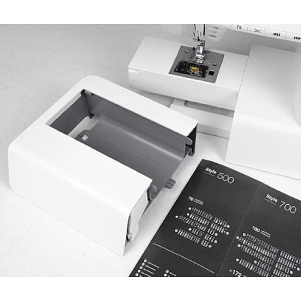 Корпус модели сделан из пластика, оснащен механизмом вдевания нити и нитеобрезателем. Конструкция обеспечена отсеком для аксессуаров. Катушка размещается вертикально. Длина сетевого шнура составляет 1 м. Прибор потребляет 70 Вт. В комплектации идет набор игл, вспарыватель, щеточка для чистки и прочие предметы. Габариты: 50х33х25 см. Вес — 7 кг.