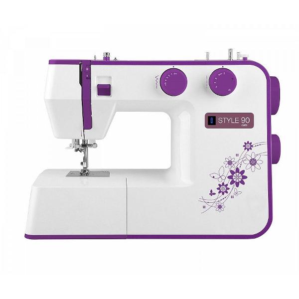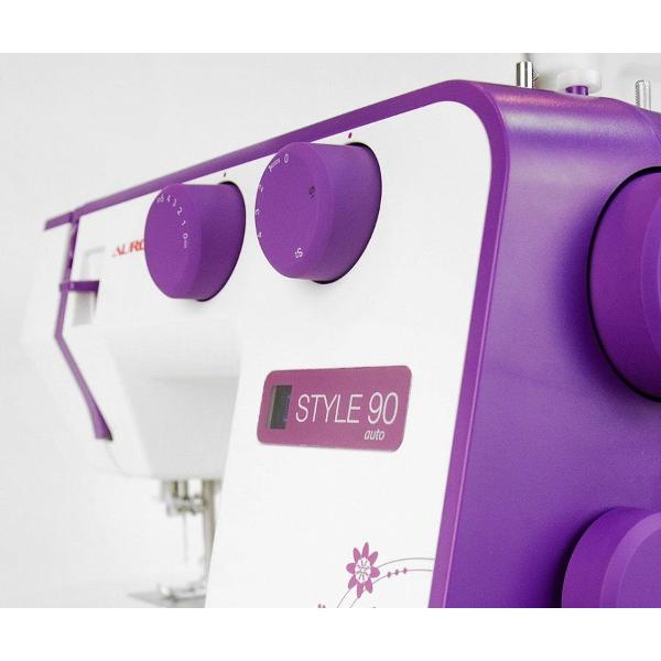Швейная машина Aurora Style 90 в корпусе белого цвета работает от электросети и потребляет 70 Вт. Длина кабеля составляет 2,5 м. Модель оснащена челноком качающегося типа. Она способна воспроизводить 22 вида строчек, включая три потайных и девять декоративных.