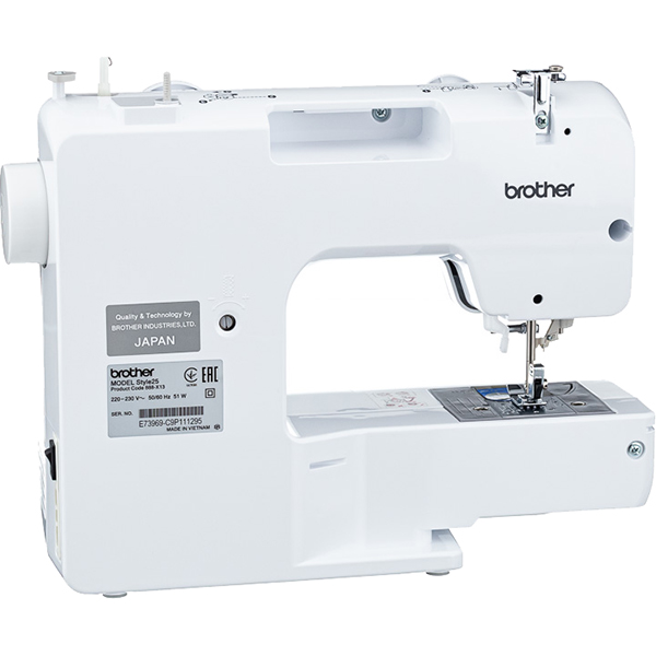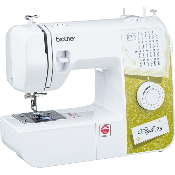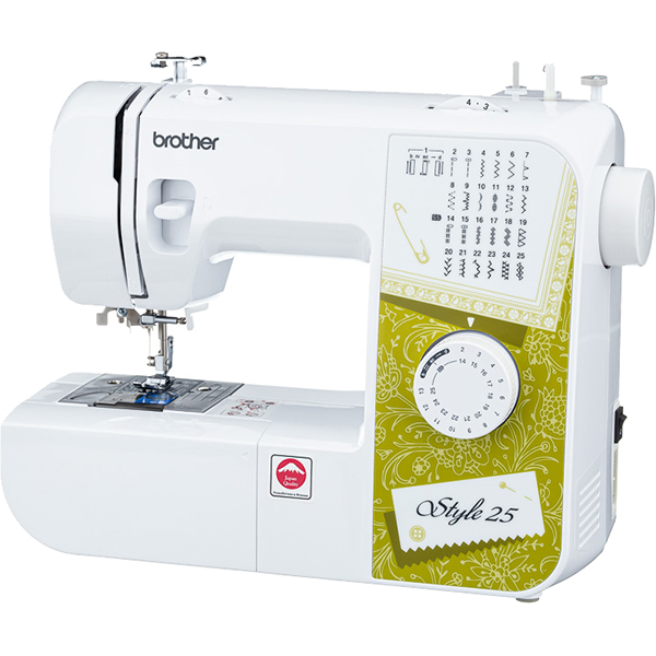 Швейная машина Brother Style 25 оборудована горизонтальным челноком, позволяет выполнять 25 операций, в том числе шить зигзагом, пришивать пуговицы, молнии, вышивать. Максимальная длина стежка — 4 мм. Двухуровневая конструкция лапки позволяет поднимать ее на высоту до 1,4 см.