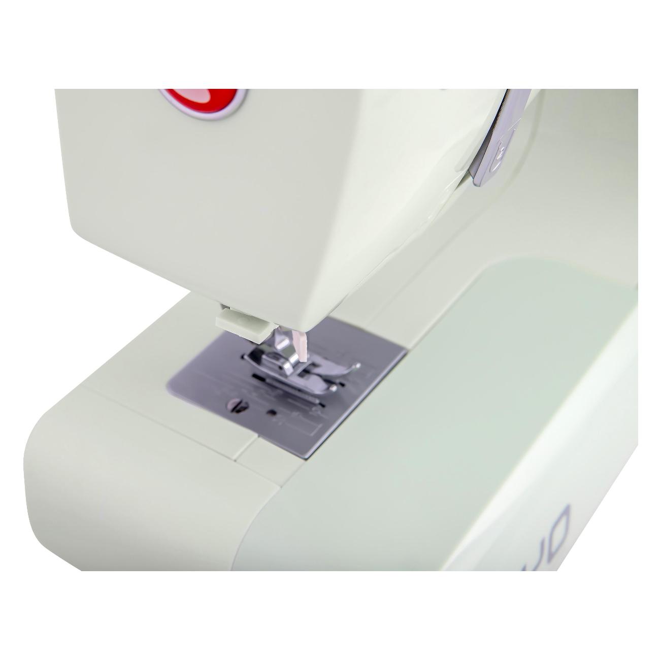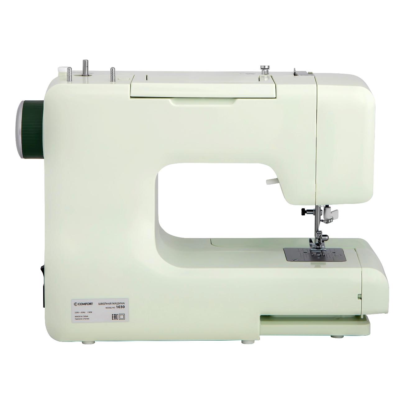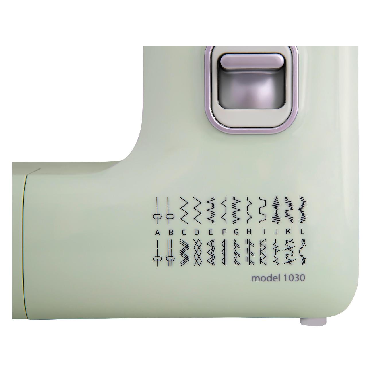 Швейная машина Comfort 1030 мятного оттенка идет в комплекте с четырьмя лапками и тремя шпульками. Длина стежка регулируется от 1 до 4 мм. Габариты модели — 29х37х15 см. Вес изделия — 6 кг. Присутствует светодиодная подсветка рабочей зоны. Скорость шитья достигает 650 стежков в минуту. Корпус сделан из прочного легкого пластика, оснащен нитеобрезателем и удобной ручкой для переноски. Прорезиненные ножки не скользят по любой поверхности. Мощность прибора — 0,1 кВт. Вертикальный челнок сделан из прочного металла. Длина отсоединяемого шнура — 1,4 м.