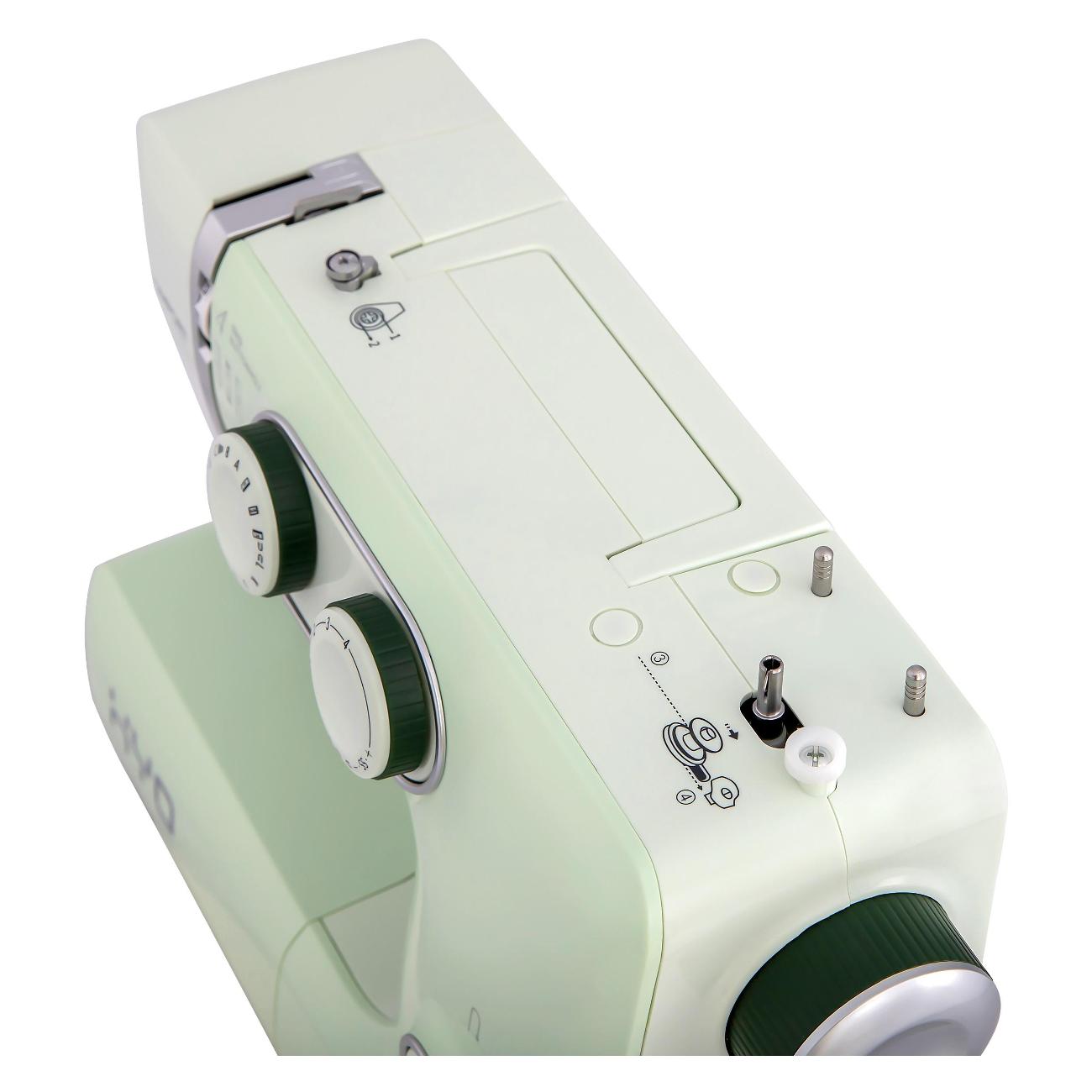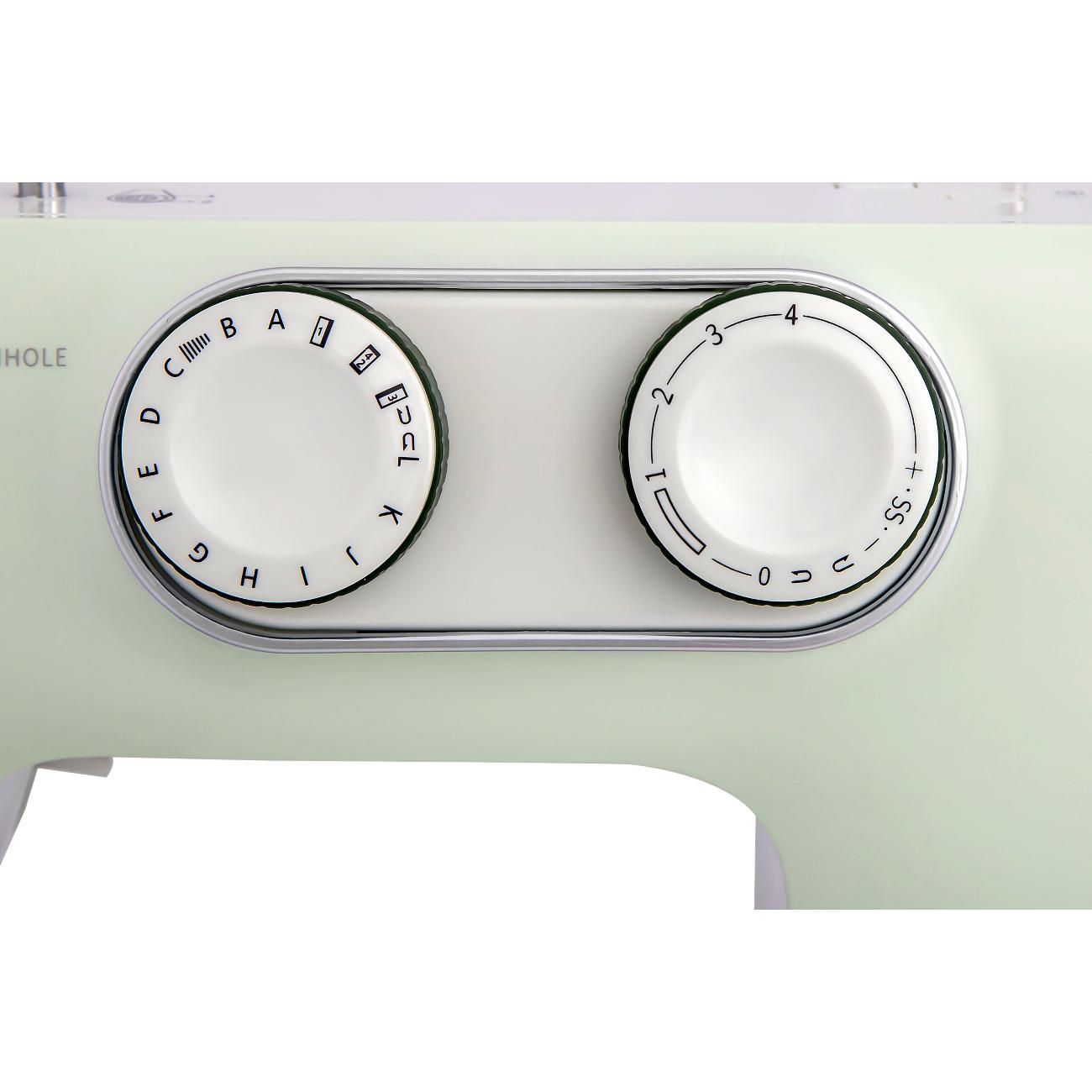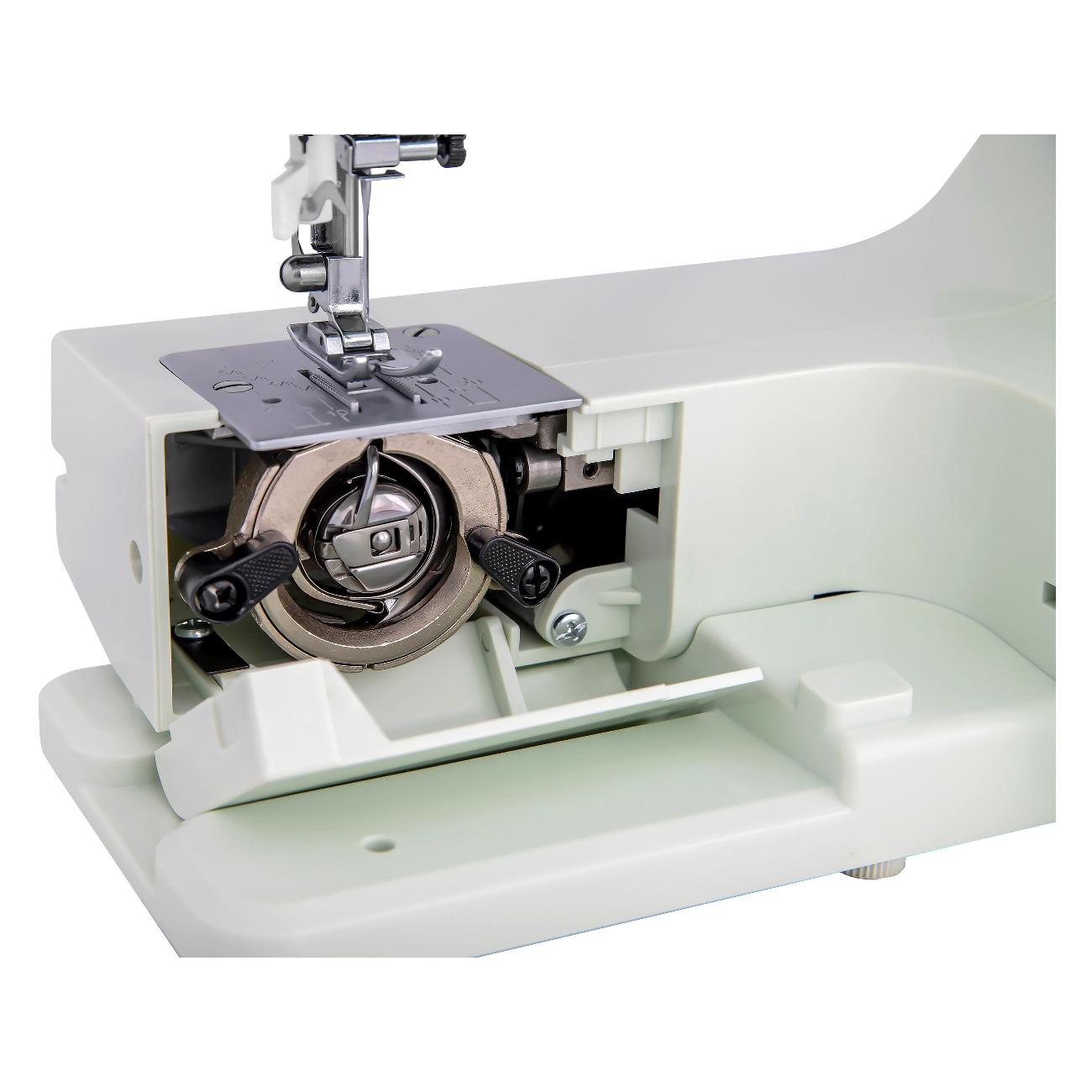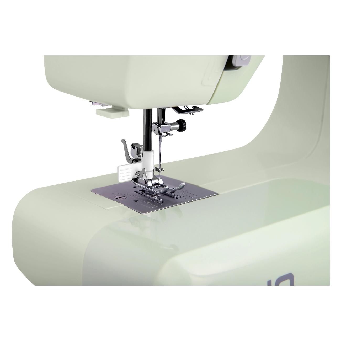 Швейная машина Comfort 1030 мятного оттенка идет в комплекте с четырьмя лапками и тремя шпульками. Длина стежка регулируется от 1 до 4 мм. Габариты модели — 29х37х15 см. Вес изделия — 6 кг. Присутствует светодиодная подсветка рабочей зоны. Скорость шитья достигает 650 стежков в минуту. Корпус сделан из прочного легкого пластика, оснащен нитеобрезателем и удобной ручкой для переноски. Прорезиненные ножки не скользят по любой поверхности. Мощность прибора — 0,1 кВт. Вертикальный челнок сделан из прочного металла. Длина отсоединяемого шнура — 1,4 м.