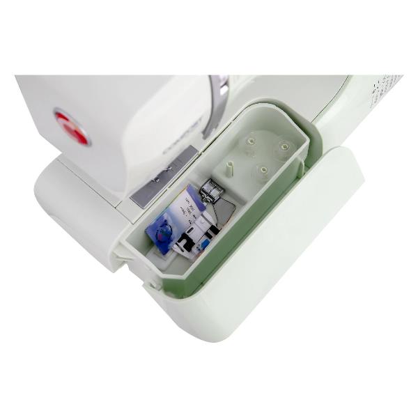 Устройство потребляет до 100 Вт электроэнергии и подключается к сети кабелем длиной 1,4 м, который можно компактно хранить в отсеке на корпусе вместе с другими аксессуарами — вспарывателем, иглами, отверткой, штопательной пластиной, щеточкой для чистки. Используя складную ручку, можно легко переносить изделие размером 29х37х15 см весом 6 кг в нужное место.