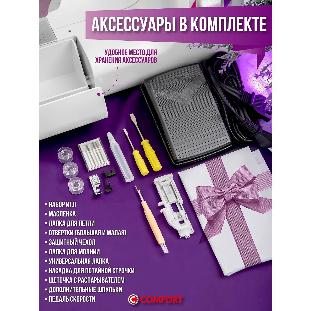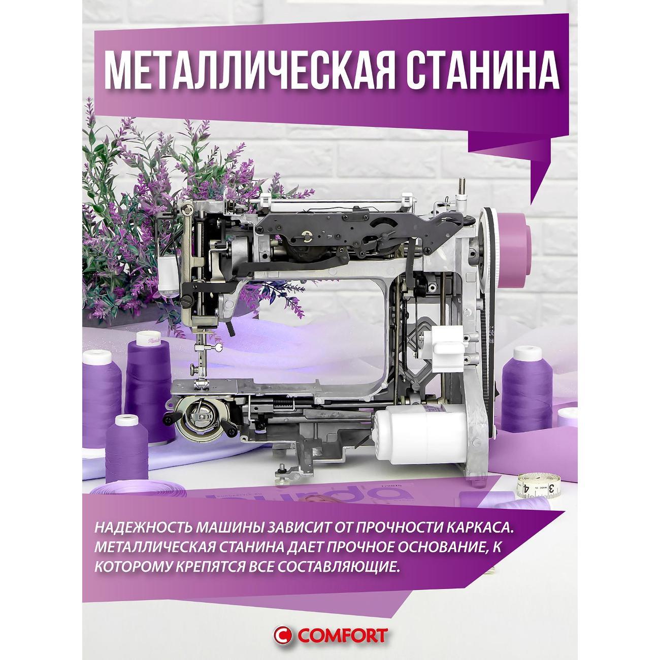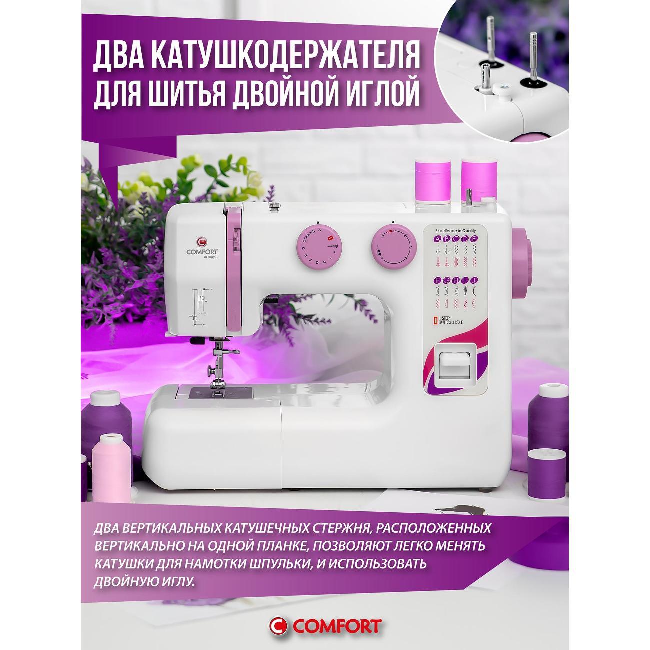 Швейная машина Comfort 17 — модель с вертикально расположенным качающимся челноком, которая может делать до 21 операции — рабочие, потайные, оверлочные, трикотажные, декоративные строчки. Выполнение петель осуществляется в автоматическом режиме. Для выбора необходимой операции в конструкции устройства предусмотрен поворотный регулятор. При необходимости можно установить оптимальную длину стежка (до 4 мм) и ширину (до 5 мм). Максимальный подъем лапки может достигать 7 мм, что дает возможность без труда укладывать плотный материал. Возможна установка разной степени натяжения нити. Максимальная скорость шитья достигает 1300 стежков в минуту.