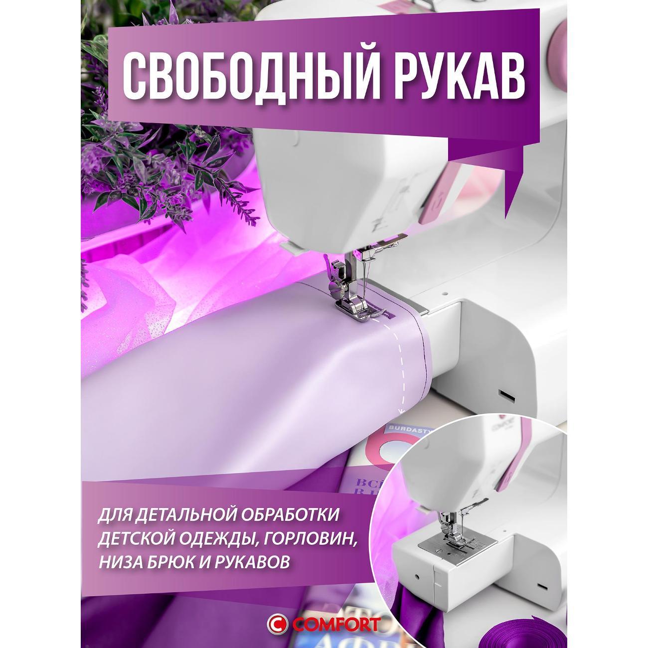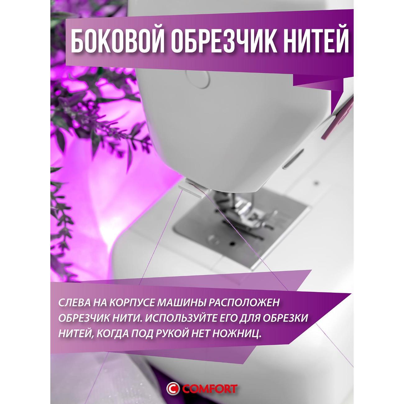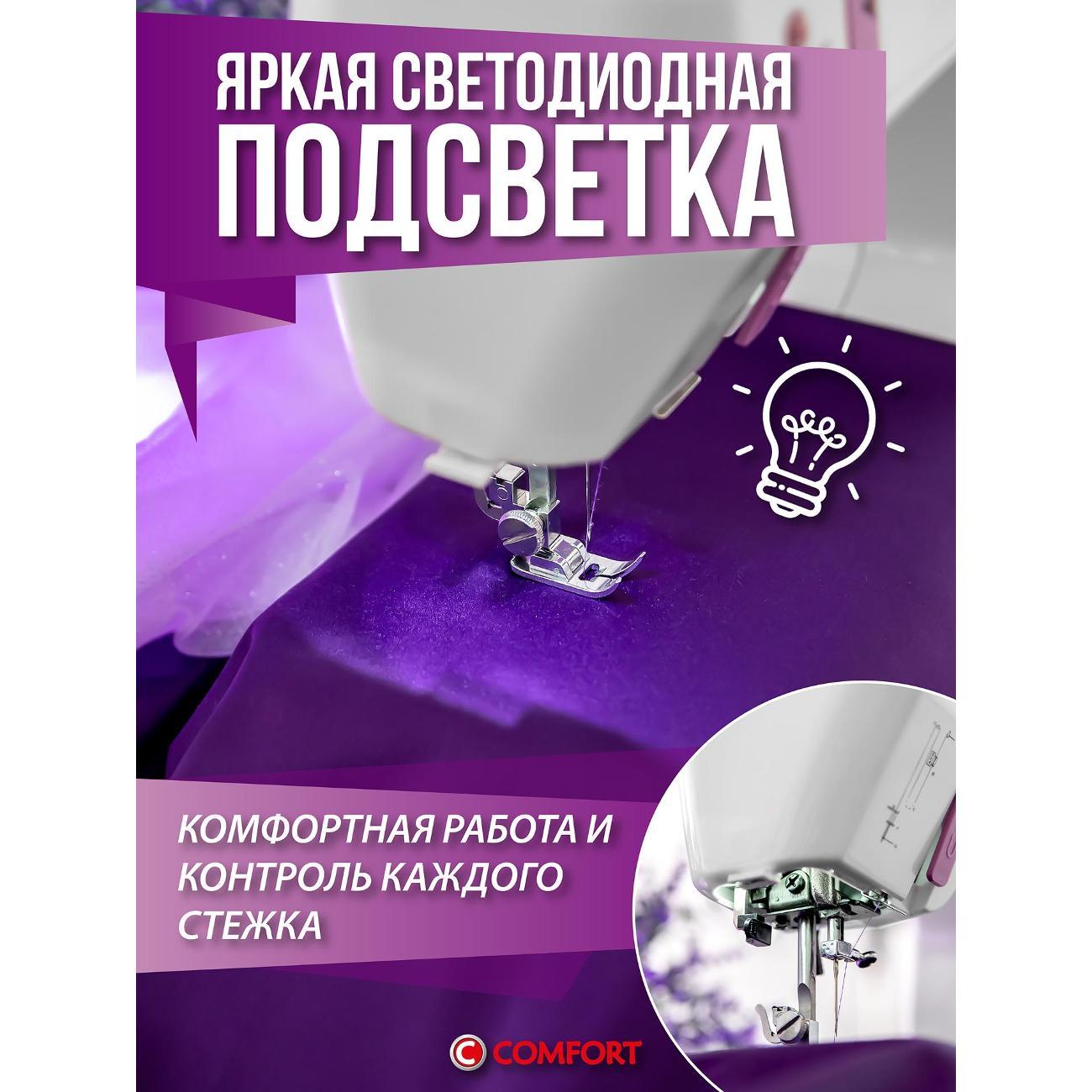 Швейная машина Comfort 17 — модель с вертикально расположенным качающимся челноком, которая может делать до 21 операции — рабочие, потайные, оверлочные, трикотажные, декоративные строчки. Выполнение петель осуществляется в автоматическом режиме. Для выбора необходимой операции в конструкции устройства предусмотрен поворотный регулятор. При необходимости можно установить оптимальную длину стежка (до 4 мм) и ширину (до 5 мм). Максимальный подъем лапки может достигать 7 мм, что дает возможность без труда укладывать плотный материал. Возможна установка разной степени натяжения нити. Максимальная скорость шитья достигает 1300 стежков в минуту.