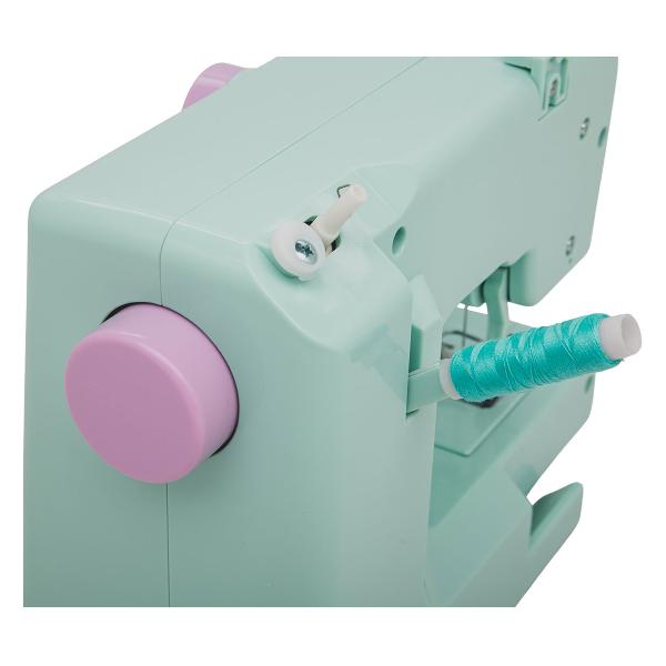 Машина оснащена горизонтальным челноком, механизмами для вдевания и обрезания нити, линейкой. Корпус выполнен из ударопрочного пластика зеленого и розового цветов. Прорезиненные ножки предохраняют от скольжения.