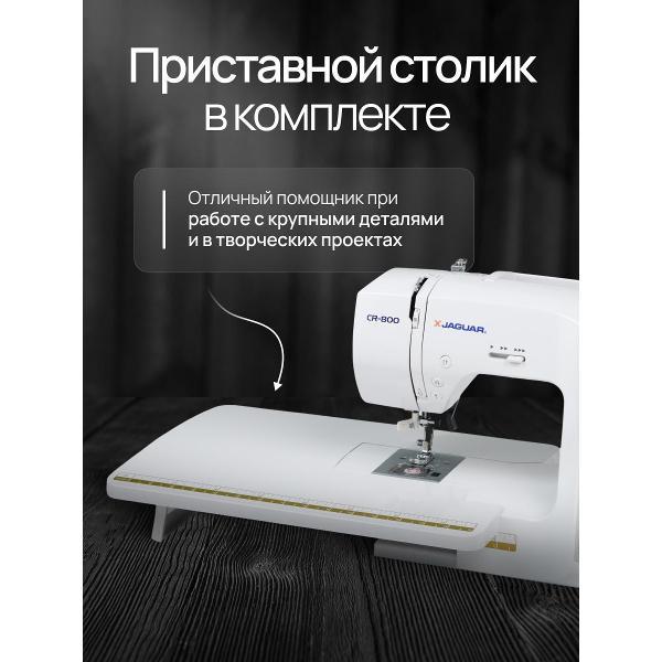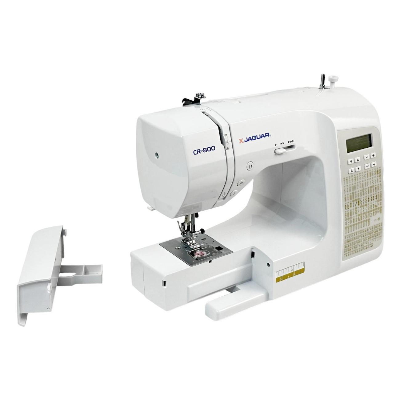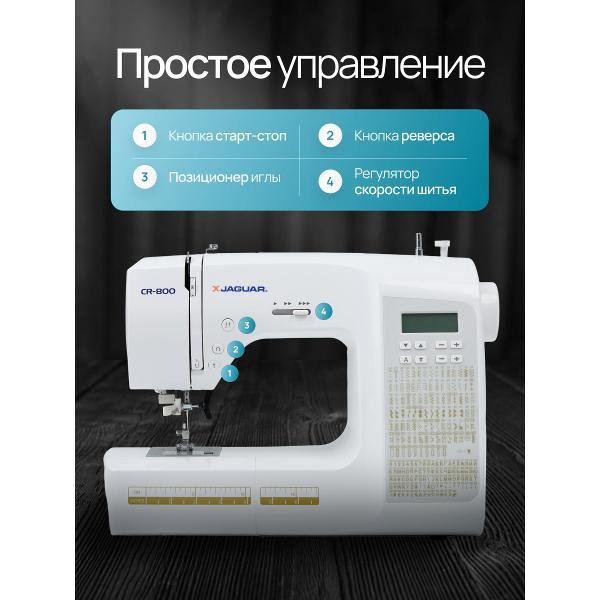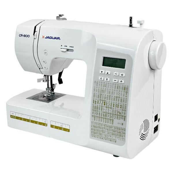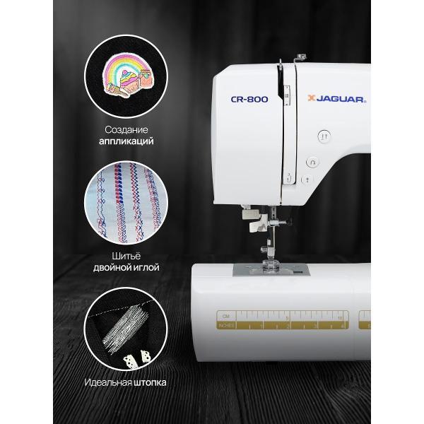 Швейная машина Jaguar CR 800 — компьютеризированное устройство, работающее с тканями любых типов. Выполняется 200 операций, девять видов автоматических петель, включая глазковые, предустановлены английский и русский алфавиты и различные символы. Управление кнопочное, настройки отображает встроенный дисплей. На корпус нанесена таблица, наглядно отображающая все возможности.