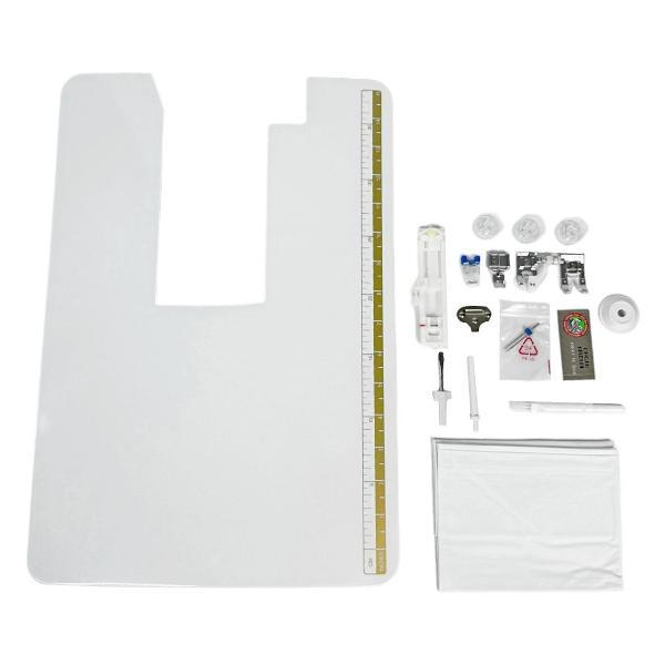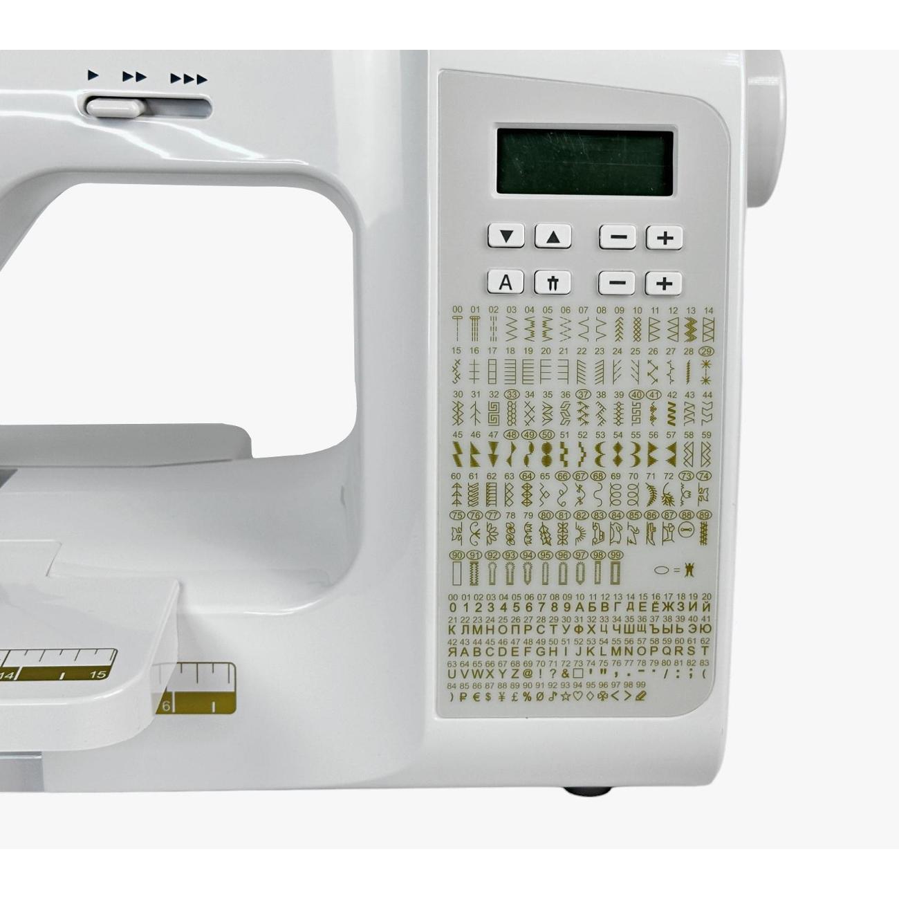 Рукавная платформа съемная, что позволит с удобством обрабатывать узкие элементы кроя. На корпус и столик нанесена линейка в сантиметрах и дюймах. Установлена яркая светодиодная подсветка для удобства работы в любое время. Потребляемая мощность — 35 Вт, длина сетевого кабеля — 1,2 м. Габариты швейной машины: 410х180х305 мм, вес — 5,5 кг.