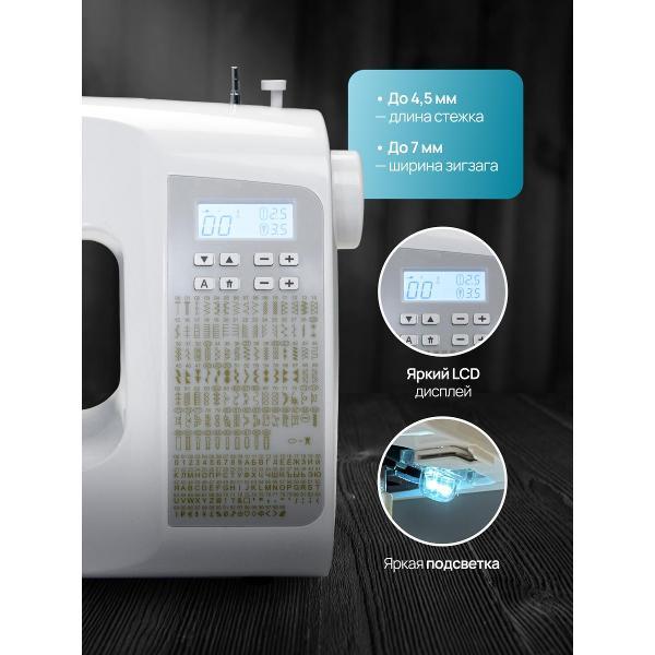 У этой модели горизонтальный челнок. Нитевдеватель автоматический, в этом же режиме наматывается нить на шпульку. Длина стежка и ширина строчки регулируются, максимальная — 4,5 мм и 7 мм соответственно.