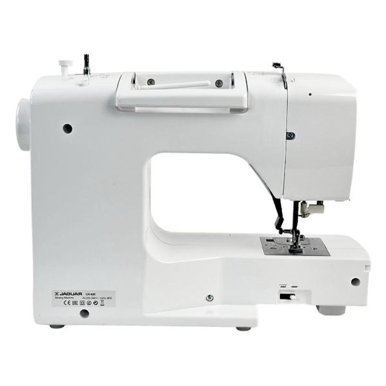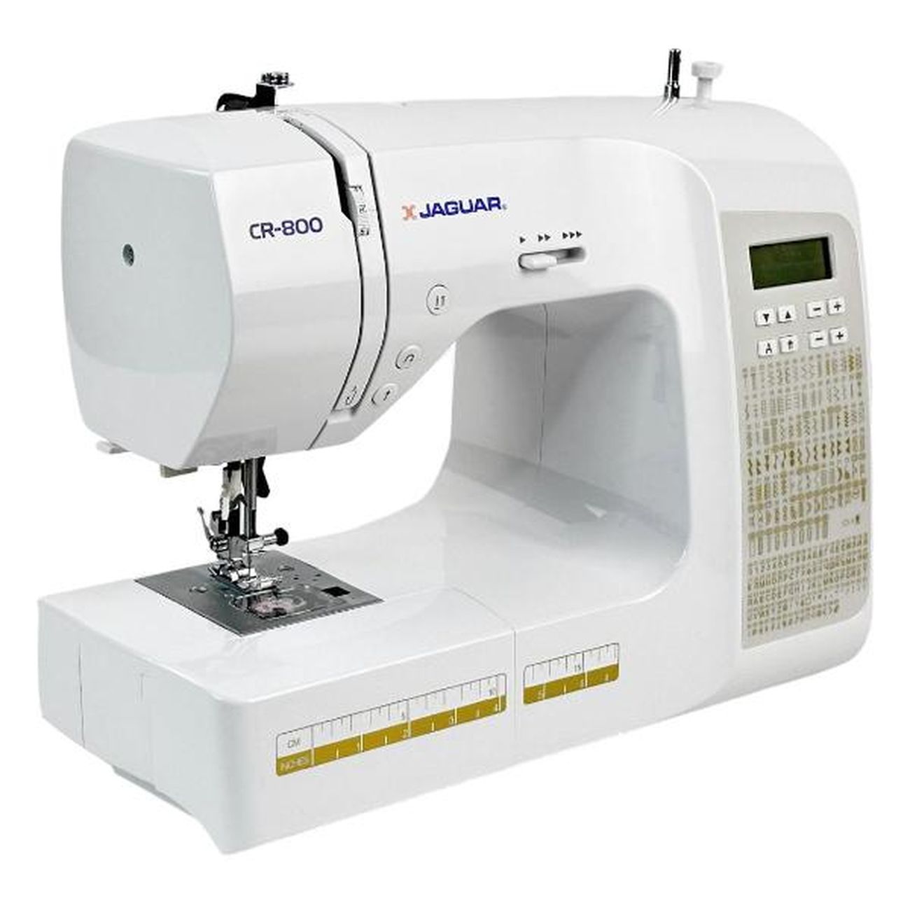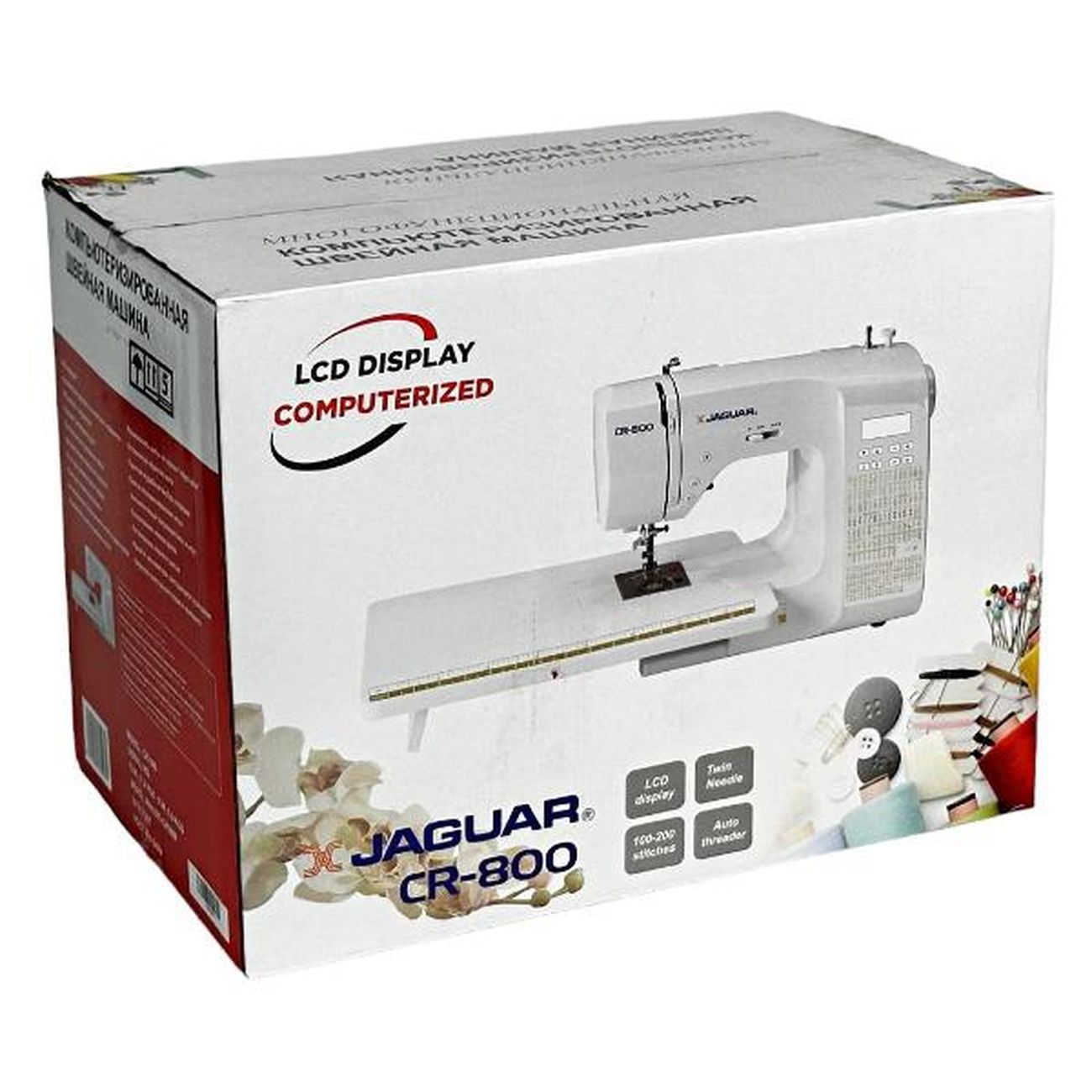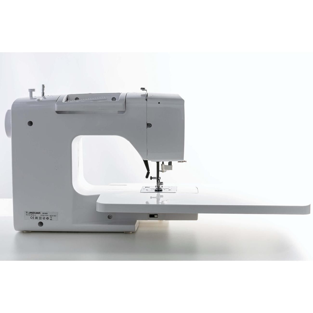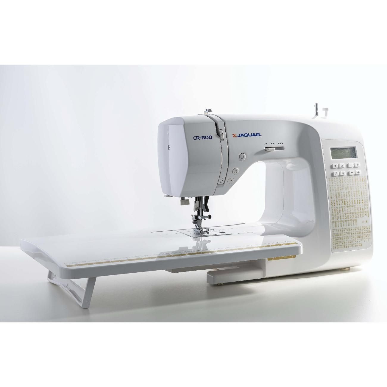 Швейная машина Jaguar CR 800 — компьютеризированное устройство, работающее с тканями любых типов. Выполняется 200 операций, девять видов автоматических петель, включая глазковые, предустановлены английский и русский алфавиты и различные символы. Управление кнопочное, настройки отображает встроенный дисплей. На корпус нанесена таблица, наглядно отображающая все возможности.