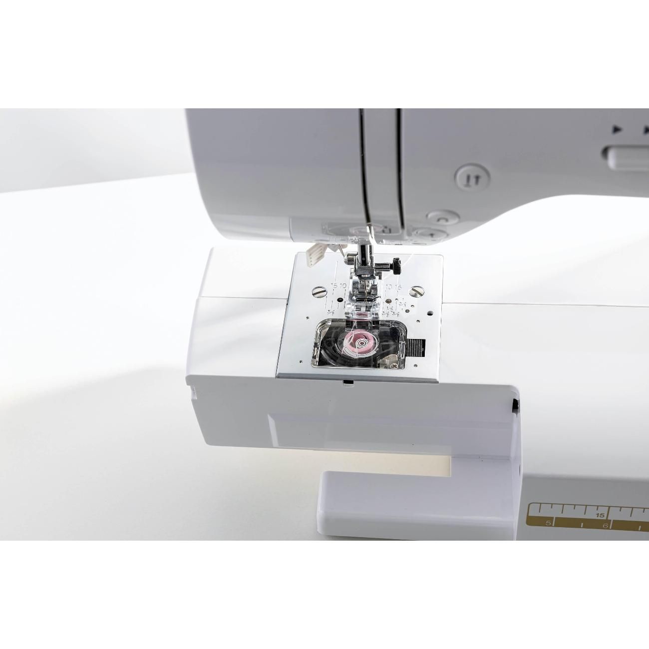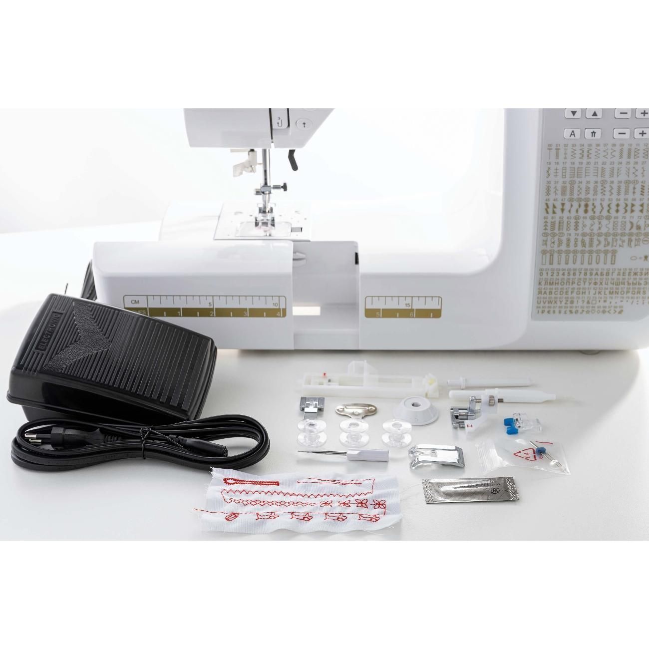 Рукавная платформа съемная, что позволит с удобством обрабатывать узкие элементы кроя. На корпус и столик нанесена линейка в сантиметрах и дюймах. Установлена яркая светодиодная подсветка для удобства работы в любое время. Потребляемая мощность — 35 Вт, длина сетевого кабеля — 1,2 м. Габариты швейной машины: 410х180х305 мм, вес — 5,5 кг.