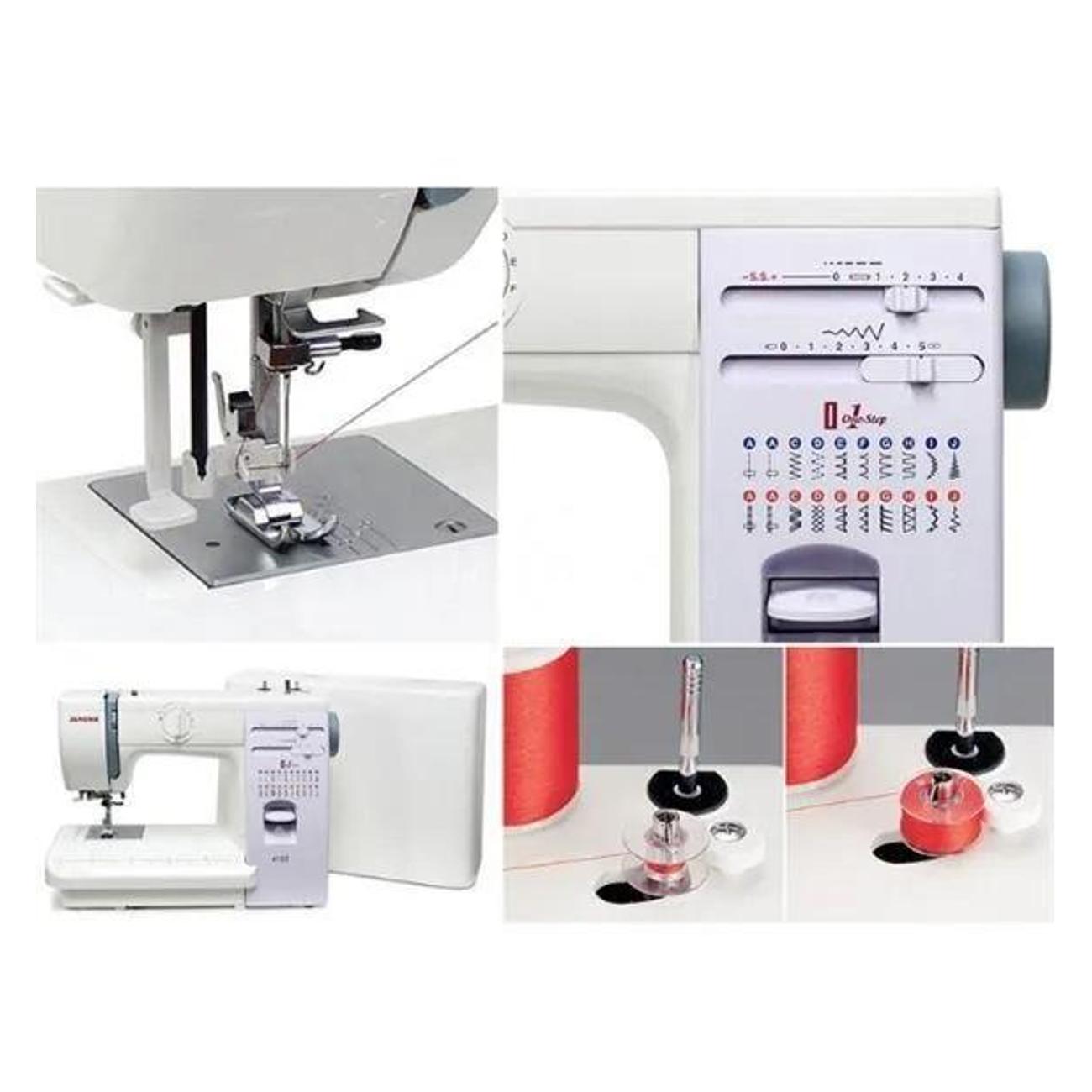 Швейная машина Janome 423S размером 29х38х16 см весит 8,1 кг и устойчиво держится на столе благодаря ножкам с прорезиненной поверхностью. Модель с вертикальным челноком управляется механическими слайдерами и поворотным регулятором. Швее доступно 23 операции, 4 рабочих, 6 оверлочных, две потайных, 8 декоративных строчек.