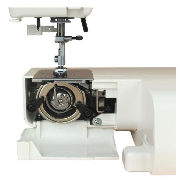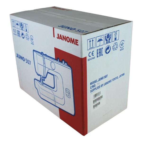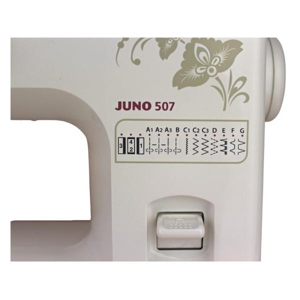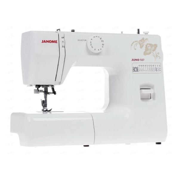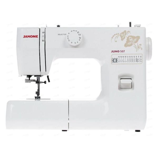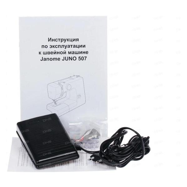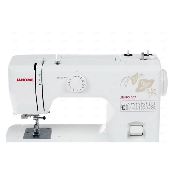 Швейная машина Janome Juno 507 белого цвета идет в комплекте с четырьмя лапками разных видов и тремя шпульками. Габариты модели — 29х18х39 см. Вес изделия — 6,7 кг. Скорость шитья регулируется до 700 стежков в минуту. Рабочая зона подсвечивается лампой накаливания. Присутствует функция реверса. Лапка поднимается на 1,1 см. Длина стежка варьируется от 0 до 4 мм. Возможно шитье двойной иглой. Корпус сделан из пластика, оснащен отсеком для хранения принадлежностей. Механизм подачи ткани отключается. Тип челнока — вертикальный, качающийся.