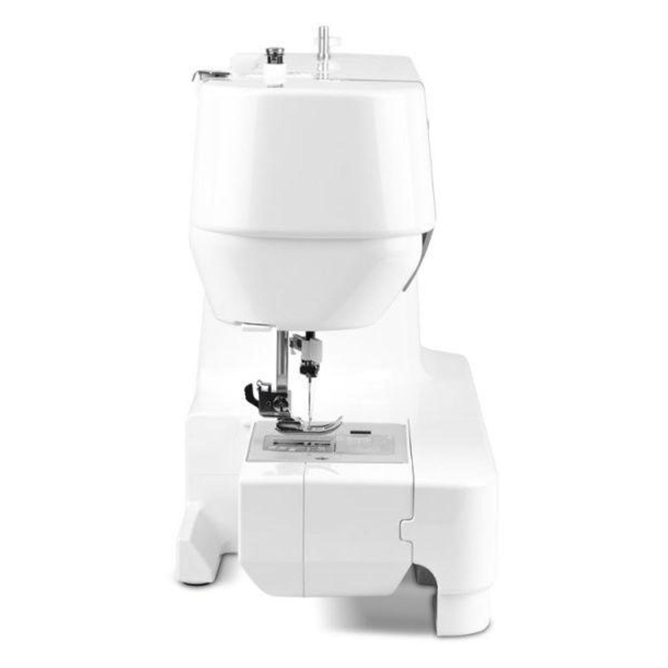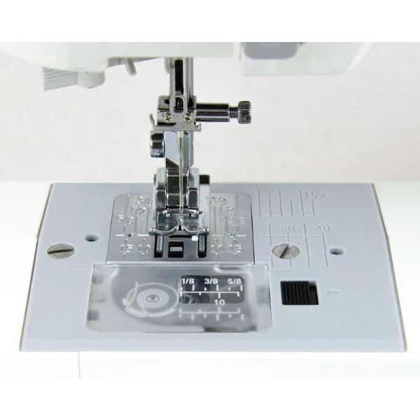 Катушка размещается горизонтально. Швейная машина комплектуется четырьмя лапками — для молний, потайной строчки и стандартной. Максимальная длина стежка составляет 4 мм. Функция реверса позволяет шить в обратном направлении. Модель дополнена LED-подсветкой для работы при плохом освещении. Ручка позволяет легко переносить устройство. Прибор потребляет всего 60 Вт.