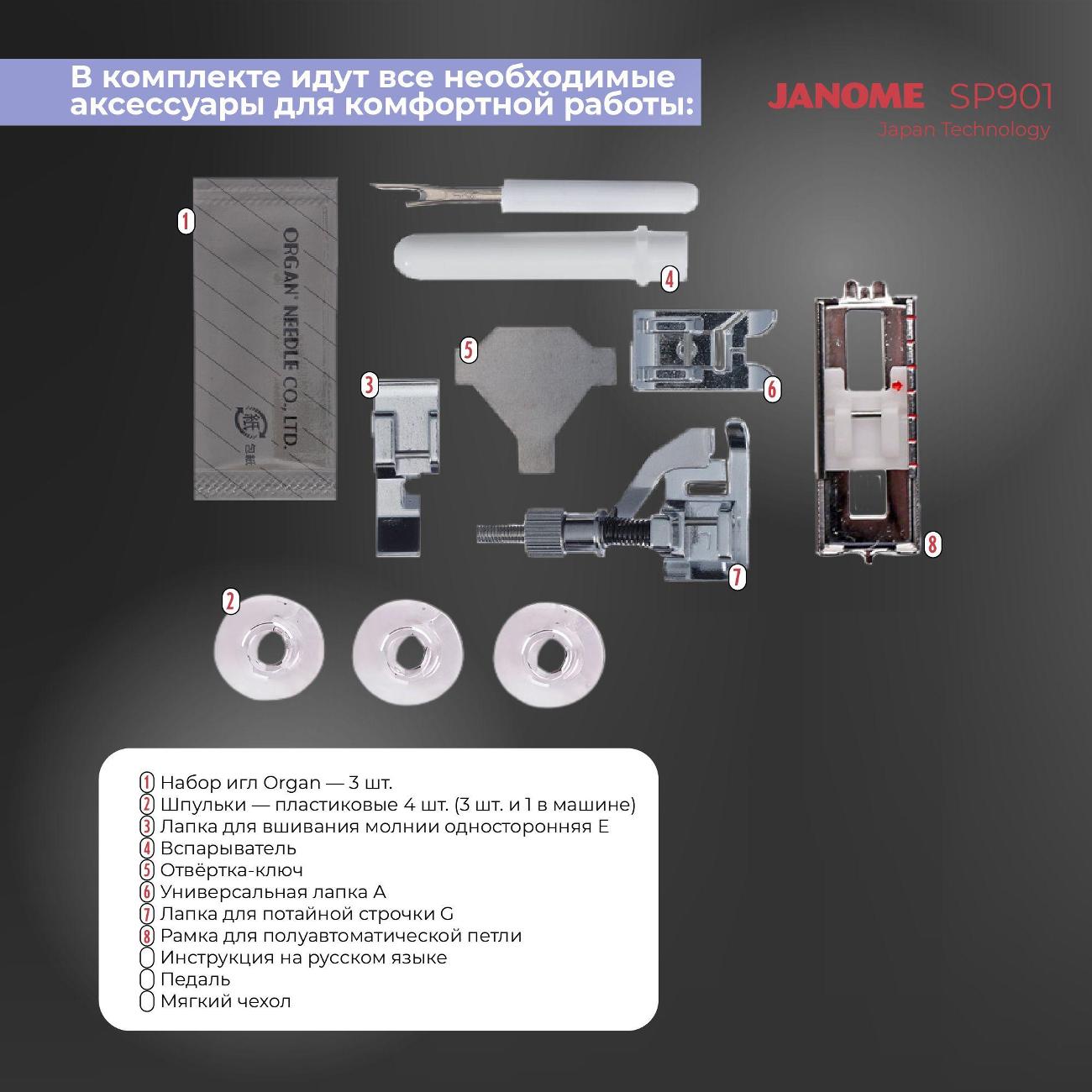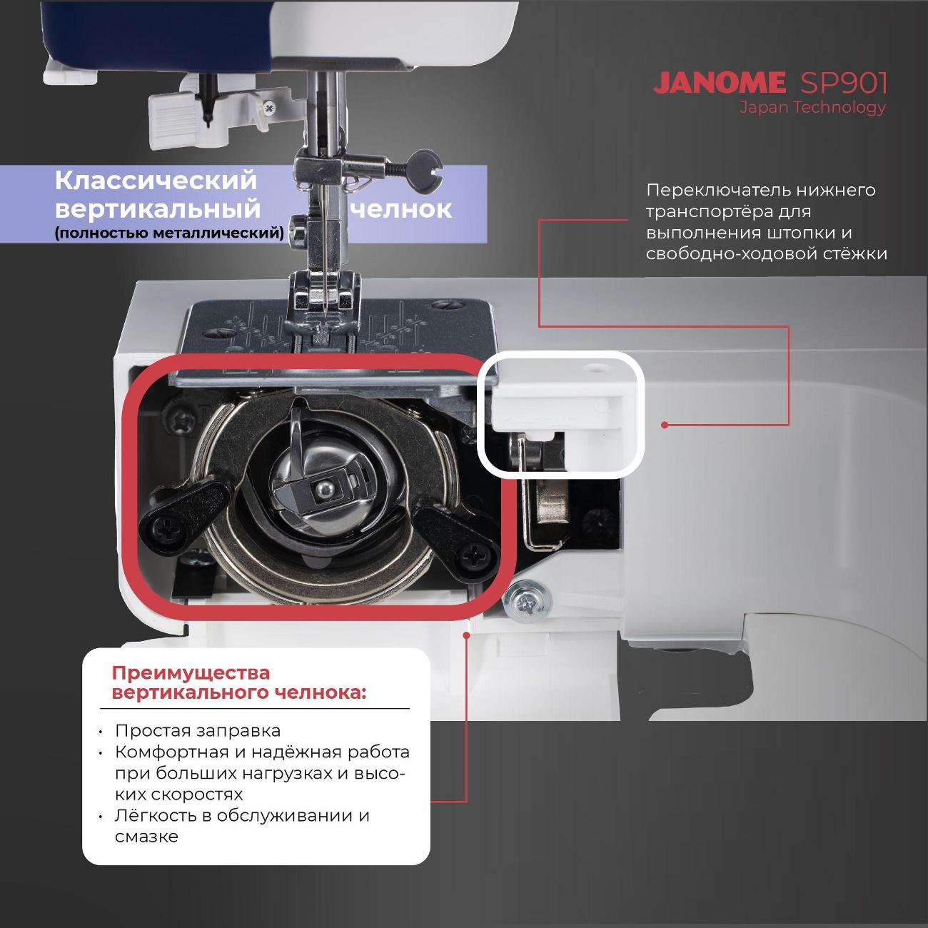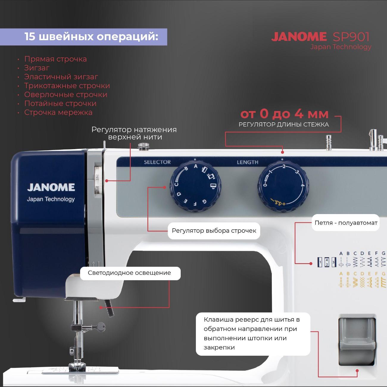 Вы можете купить Швейная машина Janome SP901 в магазинах М.Видео по доступной цене. Швейная машина Janome SP901: подробное описание, фото и отзывы реальных покупателей, характеристики, возможность скачать инструкции и подобрать аксессуары.