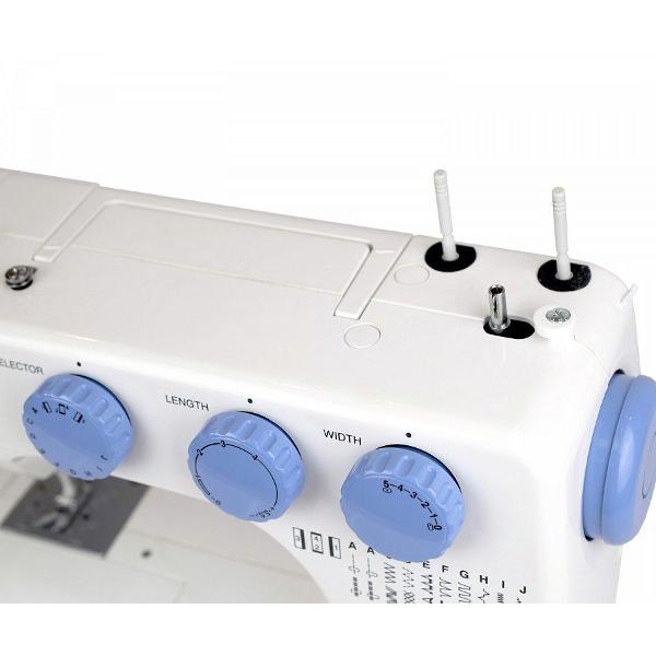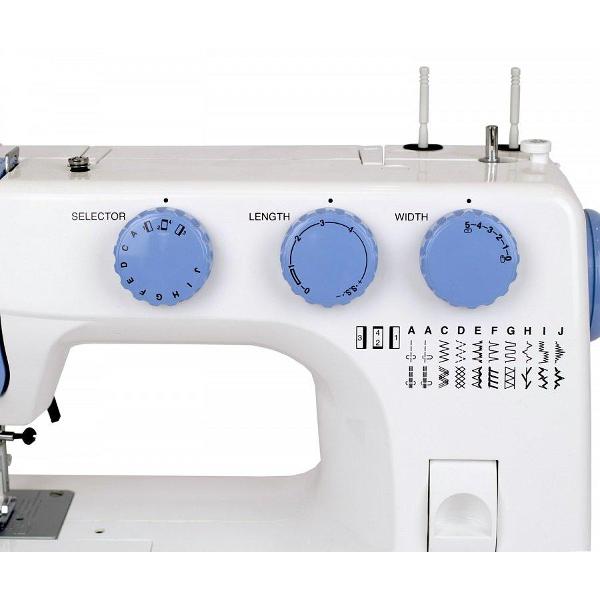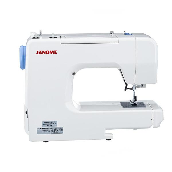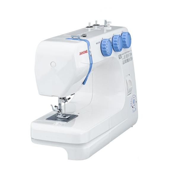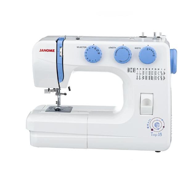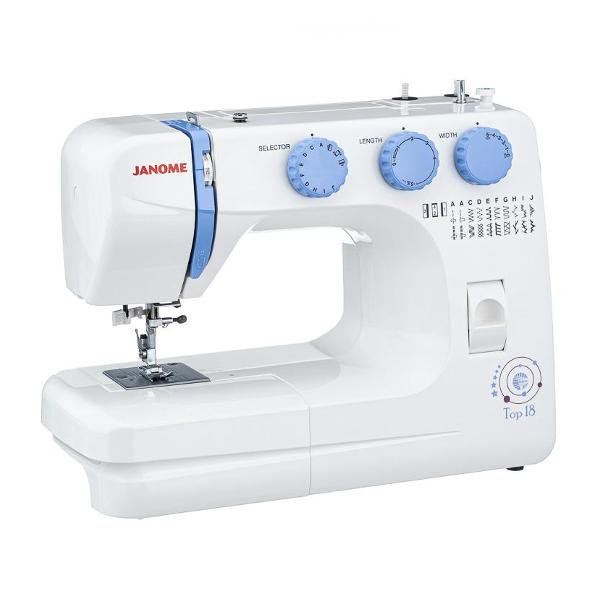 Швейная машина Janome Top 18 белого цвета подходит для ткани любой плотности. Пластиковый корпус оснащен тремя поворотными ручками для выставления параметров. Габариты модели — 29х18х39 см. Вес изделия — 6,8 кг. Количество рабочих строчек — 19. Рабочая зона подсвечивается с помощью светодиодной лампы. В комплекте идут мягкий чехол для хранения, четыре лапки, три шпульки, вспарыватель, штопательная пластика и набор игл. Катушка расположена вертикально. Лапка поднимается на 1,2 см. Прибор оснащен вертикальным качающимся челноком из металла.