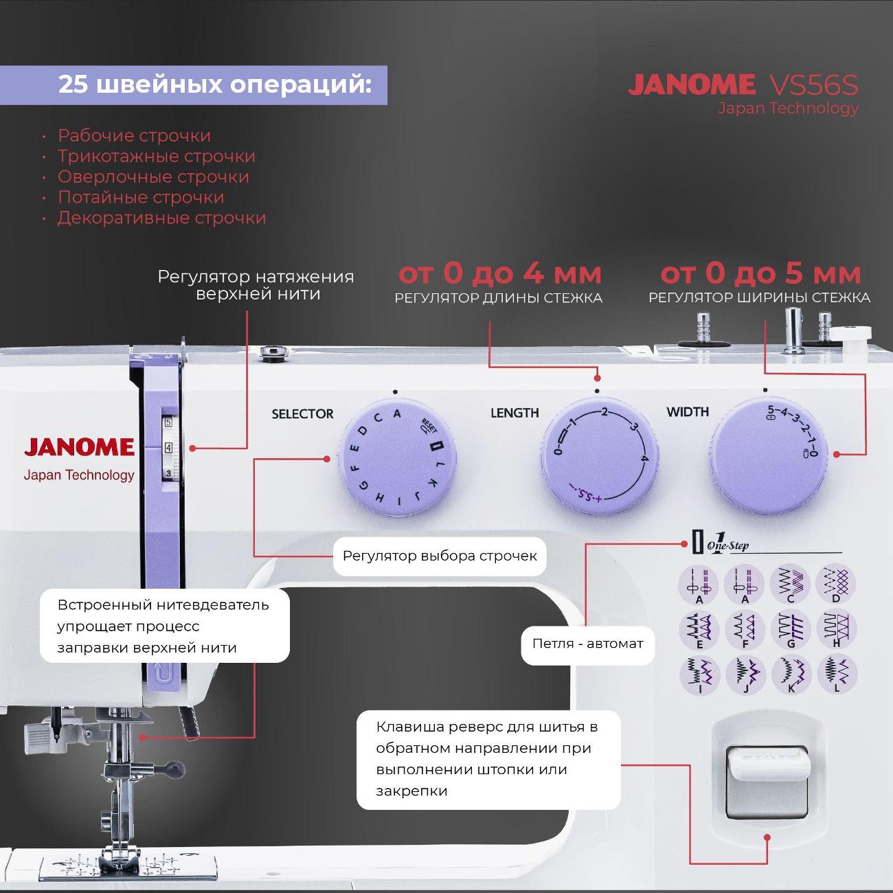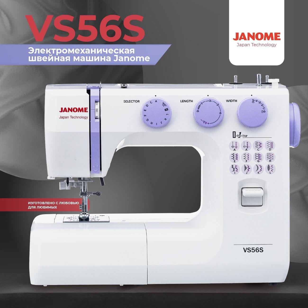 Вы можете купить Швейная машина Janome VS-56S в магазинах М.Видео по доступной цене. Швейная машина Janome VS-56S: подробное описание, фото и отзывы реальных покупателей, характеристики, возможность скачать инструкции и подобрать аксессуары.