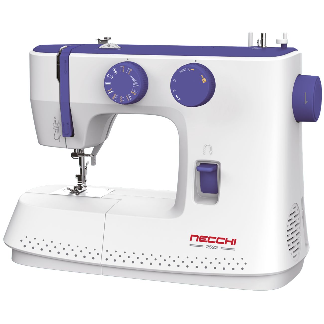 Necchi 2522 — швейная машина с электромеханической системой управления. Она позволяет выполнять 22 операции на легких и средних по плотности тканях, в том числе автоматически выметывать бельевые и стандартные петли. Регуляторы находятся сверху и спереди. Прибор оборудован вертикальным челноком, встроенной подсветкой, в комплекте есть съемная рукавная платформа. Максимальная длина стежка — 5 мм. Габариты модели — 38 х 29 х 16 см, вес — 5,4 кг.