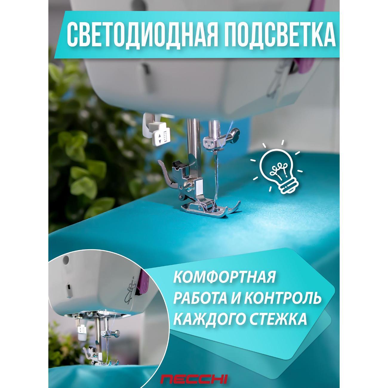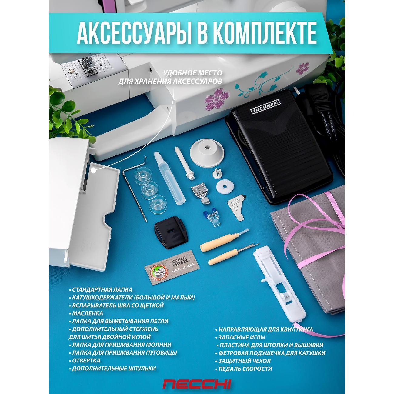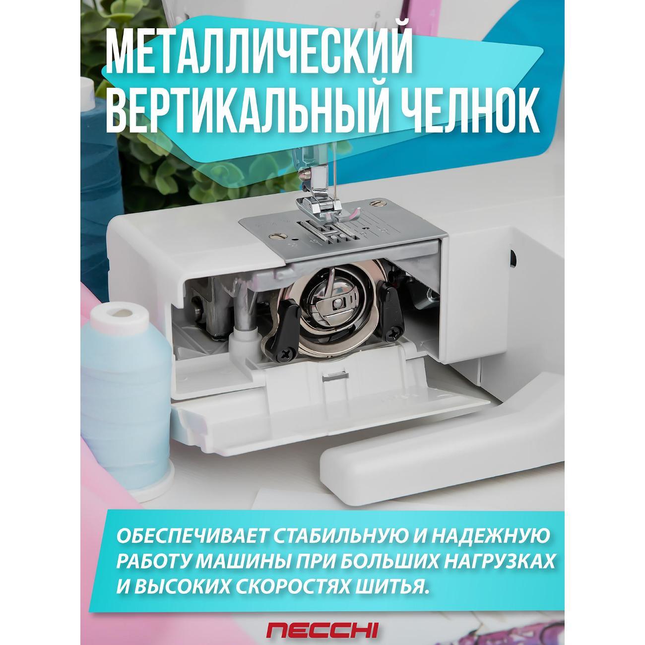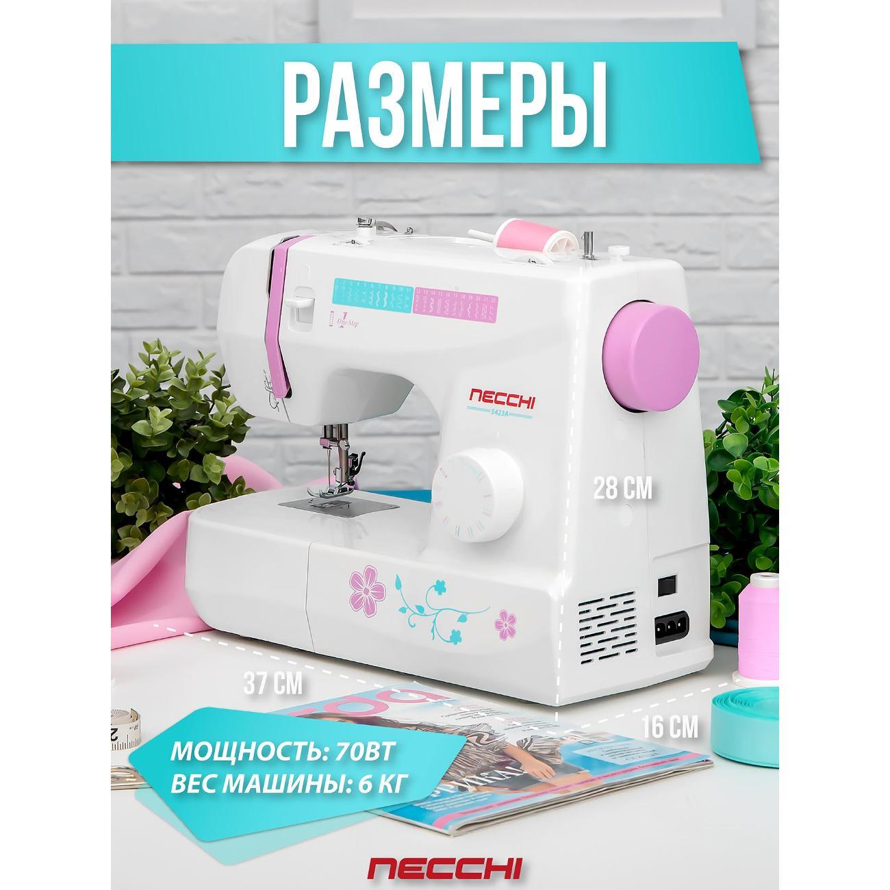 Швейная машина Necchi 5423 А, белая оснащена электромеханической системой управления с функцией реверса. Катушка размещается вертикально. Присутствуют отсек для аксессуаров, механизм вдевания нити и нитеобрезатель.