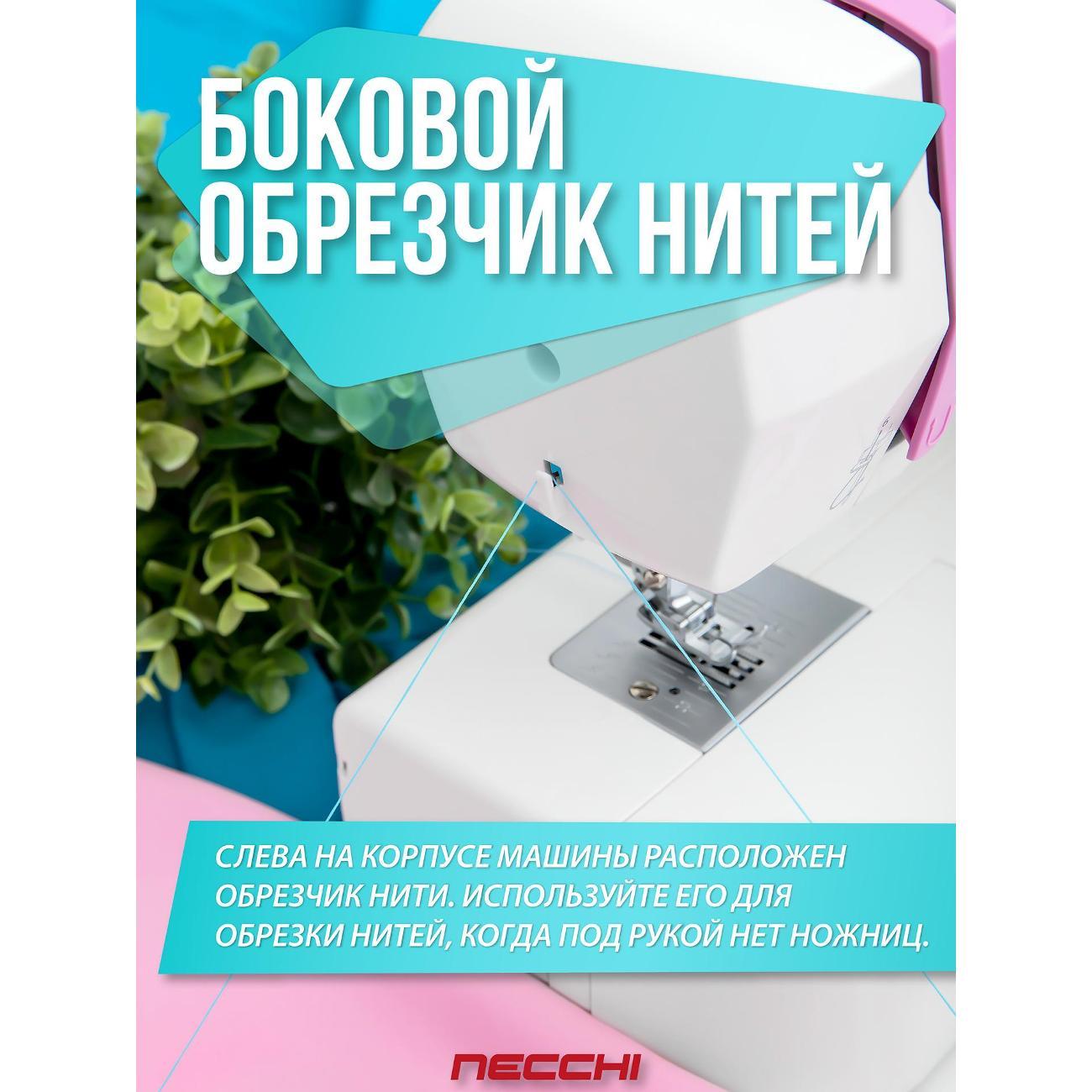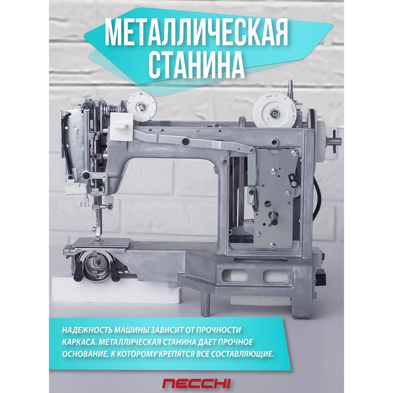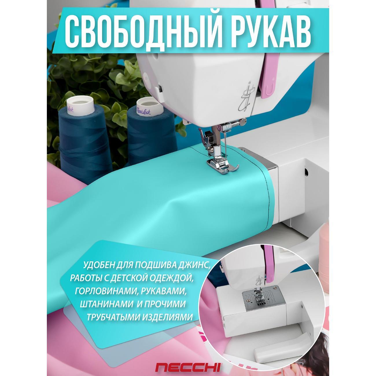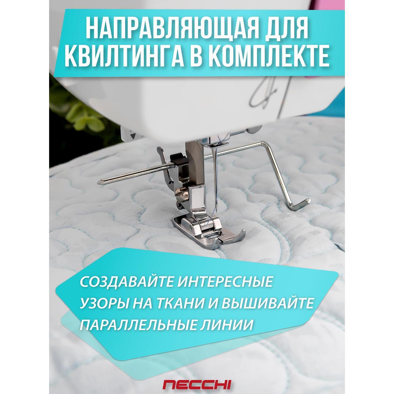 Швейная машина Necchi 5423 А, белая оснащена электромеханической системой управления с функцией реверса. Катушка размещается вертикально. Присутствуют отсек для аксессуаров, механизм вдевания нити и нитеобрезатель.