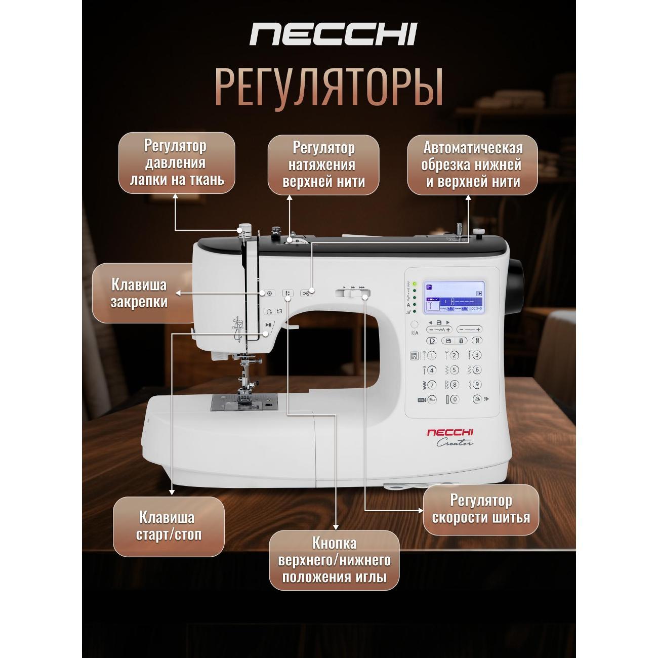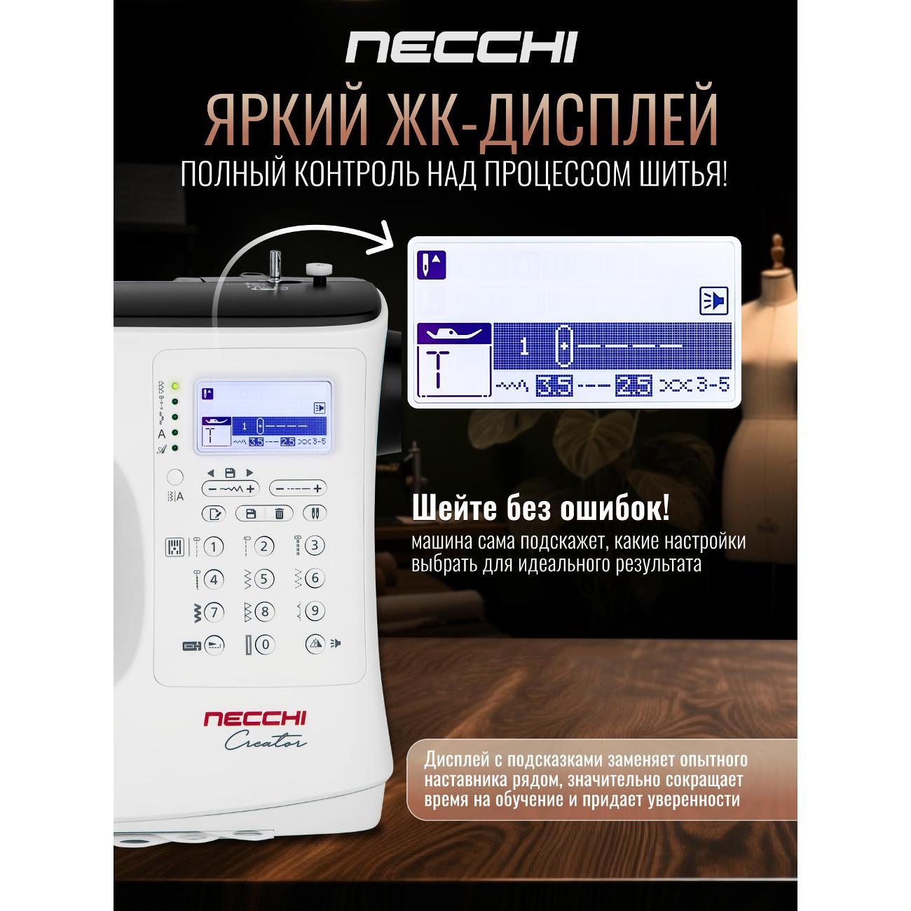 Швейная машина Necchi NC-205D в корпусе классическая белой расцветки поддерживает 360 операций. Модель выполняет рабочие, оверлочные, декоративные, трикотажные строчки, может вышивать буквы английского алфавита. Максимальная длина стежка — 4,5 мм, ширина — 7 мм. Швейная машина оснащена встроенной памятью, в которую можно записать до 40 символов для последующего переноса на ткань. Также устройство выполняет 13 видов пуговичных петель. В комплекте поставляется дополнительный рабочий столик габаритами 44х28 см.