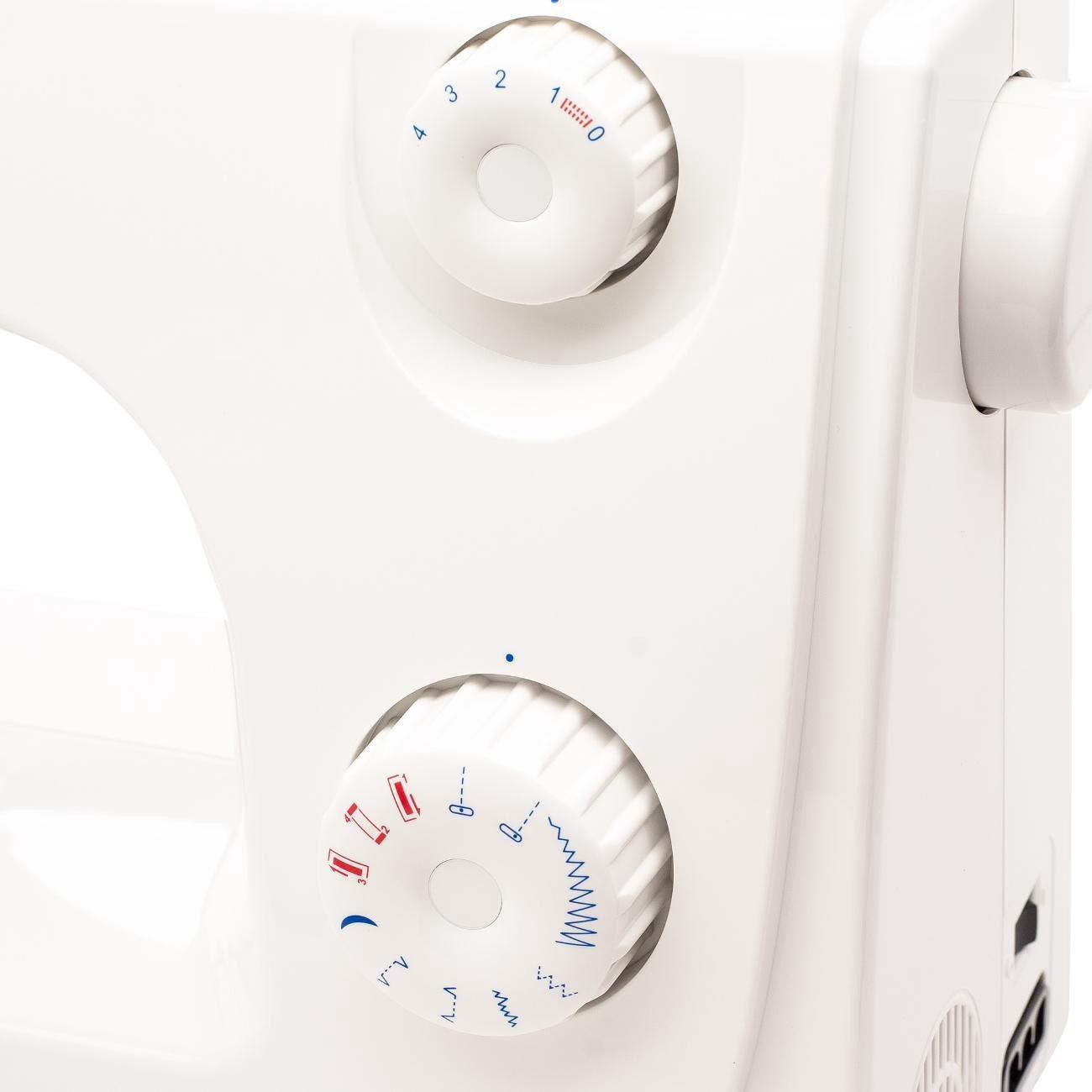 Можно выбрать нужную рабочую, потайную, трикотажную, декоративную строчки, ширину зигзага, высоту подъема лапки (до 7 мм), ширину стежка (до 5 мм). Подсветка и нитеобрезатель увеличивают комфорт при применении инструмента. В наборе поставляются четыре лапки, три шпульки, вспарыватель, направитель ткани, штопательная пластина, отвертка, масленка, щеточка для чистки, чехол с ручкой для переноски.