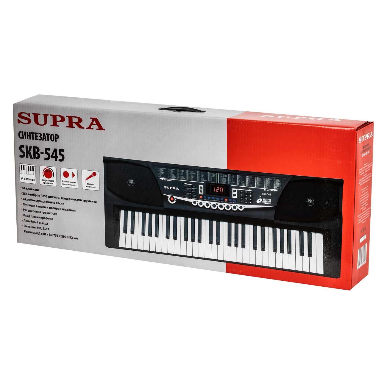 Синтезатор Supra SKB-545 черного цвета оснащен 24 демонстрационными песнями и 255 ритмами. Клавиши полноразмерные (54 штуки). Громкость регулируется. Присутствуют функция обучения и разделение клавиатуры, эффекты вибрато и сустейн. Корпус сделан из прочного пластика, оснащен разъемами для микрофона и наушников 3,5 мм, портами USB 2.0, цифровым дисплеем. Габариты модели — 9,2х77,5х29 см. Вес изделия — 300 г. Устройство работает от сети или от батарей АА. В комплектацию входят блок питания, пюпитр и микрофон.
