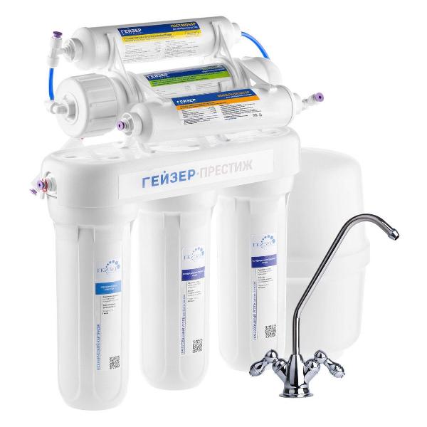 Система для очистки воды «Гейзер» «Престиж-М» (20007) с механическим типом управления и обратным осмосом поставляется с тремя картриджами. Модель обеспечивает комплексную фильтрацию и умягчение, задерживает частицы хлора, препятствует образованию накипи. Предельное рабочее давление составляет 8 атм. Устройство подходит для обработки воды в температурном диапазоне от 4°C до 40°C. Производительность — 0,14 л/мин. В комплект входят кран, накопительный бак вместимостью 12 л. Корпус делан из непрозрачного пластика белого цвета. Размеры — 48х44х45 см. Вес — 8 кг.