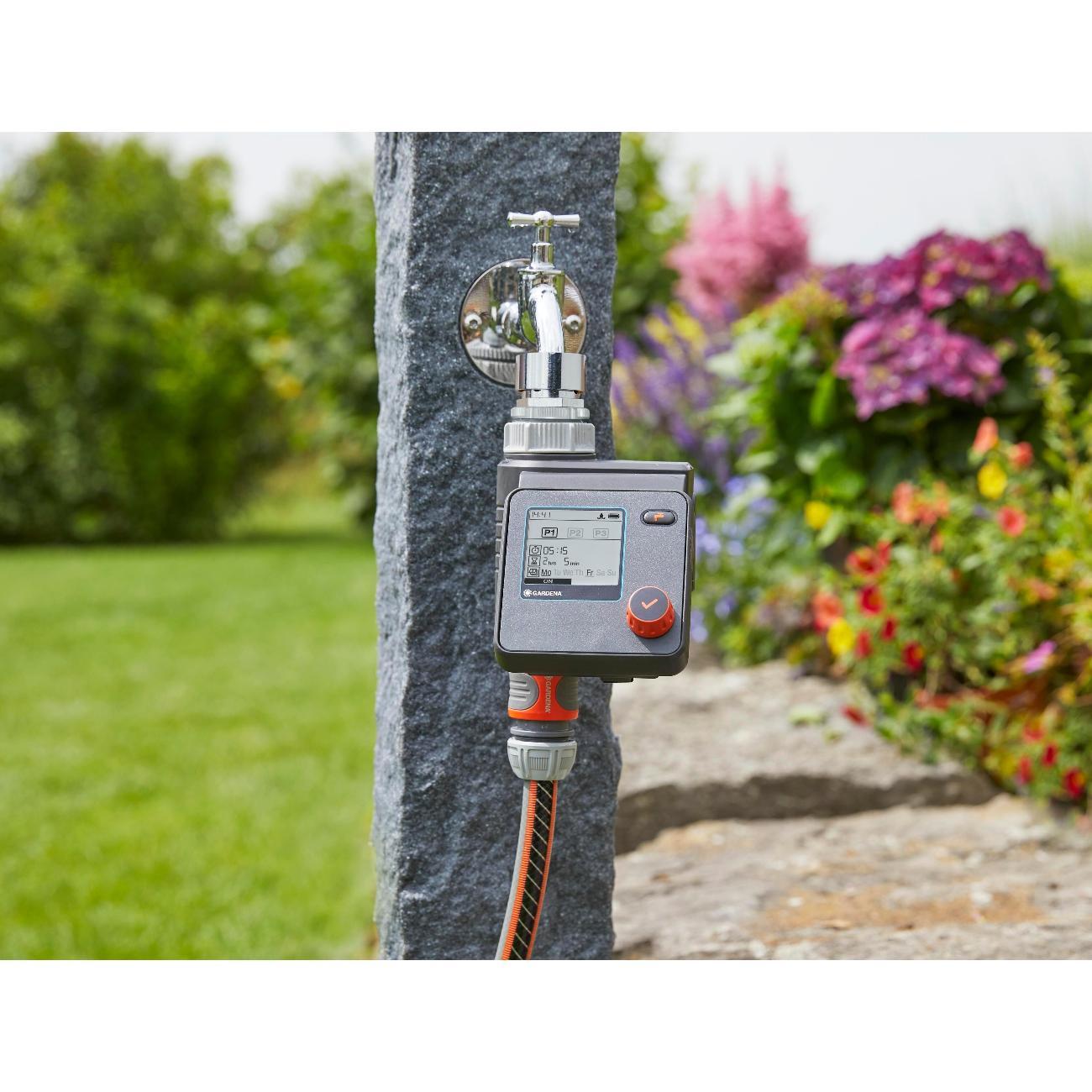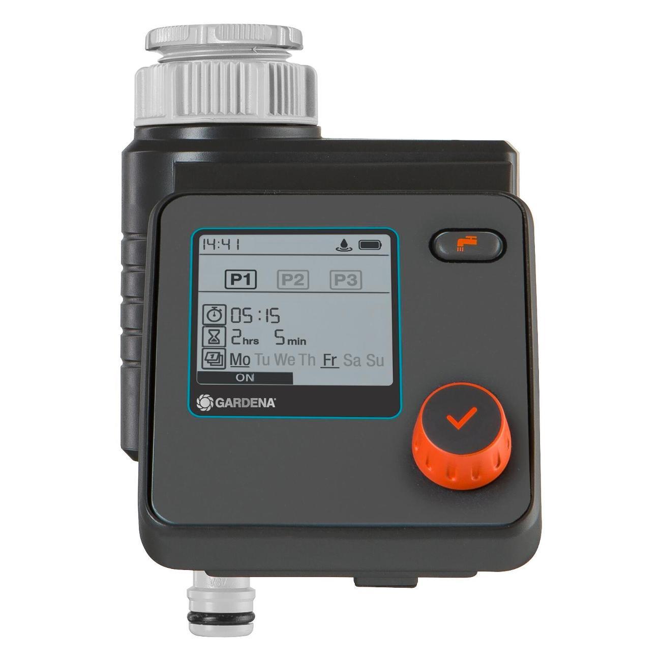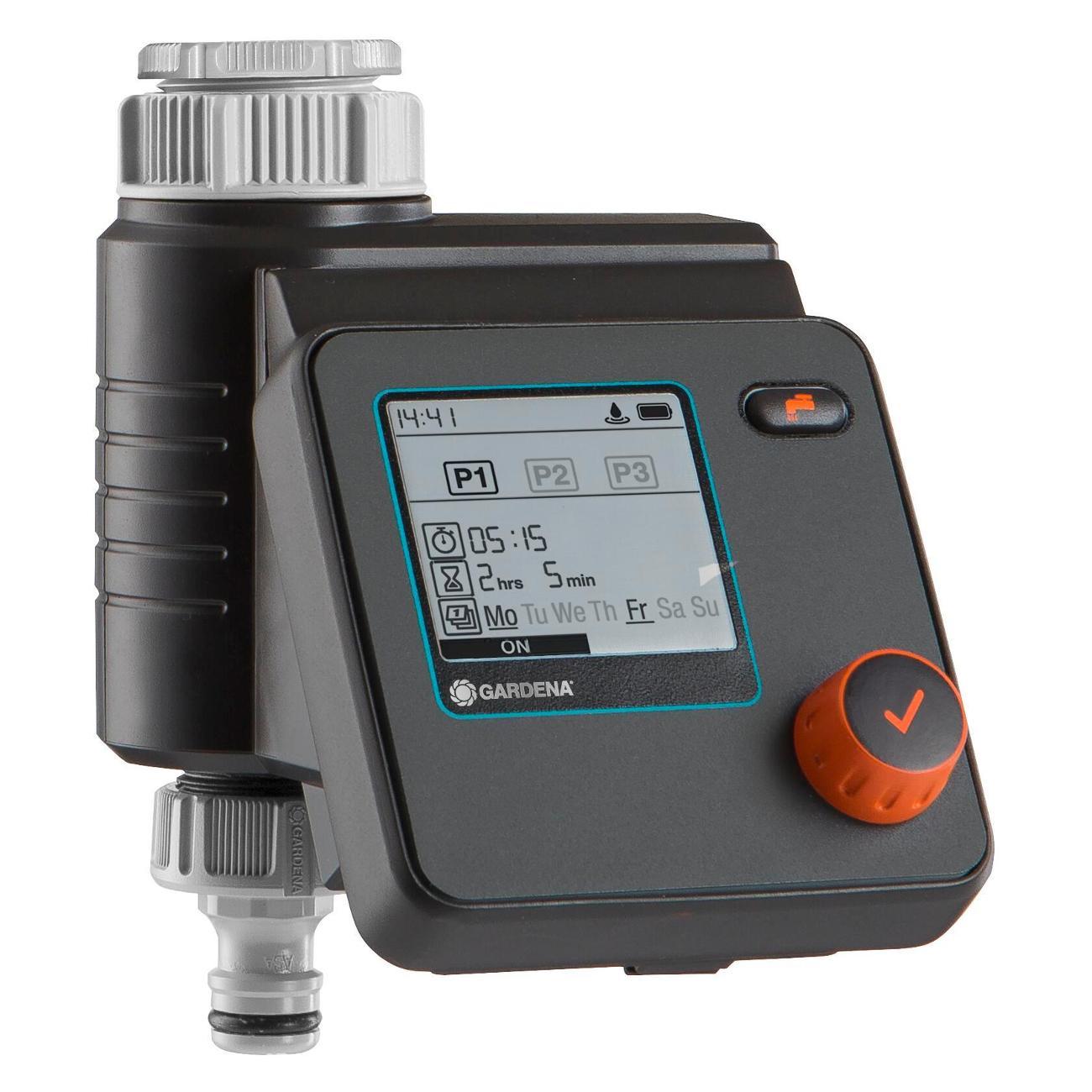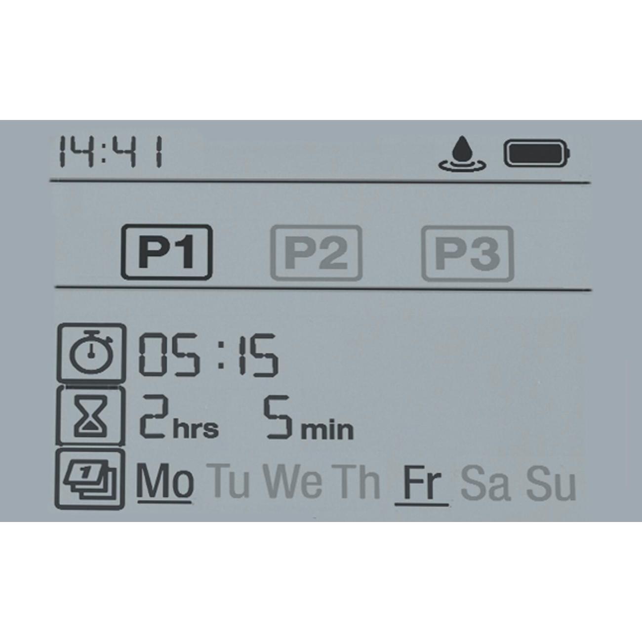 Индивидуальные настройки 6 независимых расписаний полива, интуитивно понятное управление при помощи одной кнопки - поворотная кнопка (поворот - для выбора настроек, нажатие - для подтверждения выбора). Централизованное уменьшение продолжительности полива всех расписаний в зависимости от сезона, функция "остановки во время дождя", контроль до 6 линий полива с помощью автоматического распределителя воды (арт. 1197 - покупается отдельно). Питание - 1 щелчная батарейка типа крона 9 В (не входит в комплект), ЖК-дисплей с гибким текстовым меню, 6 запрограмированных расписаний (начало полива, продолжительность, частота). Время старта настраивается, продолжительность полива от 1 мин. до 4 ч., съемная панель управления, совместимость с датчиком влажности почвы, функция ручной полив с автоматической остановкой, индикатор заряда батерейки, технология безопасной остановки safe stop, защита от детей (блокировка/разблокировка экрана), устойчив к погодным условиям. Сделано в Германии.