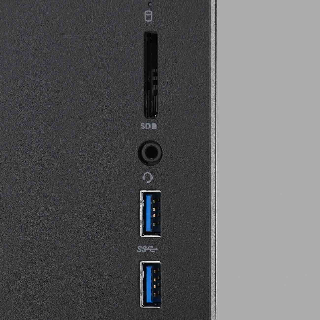 В системном блоке предусмотрены беспроводные интерфейсы Wi-Fi и Bluetooth для доступа в интернет и подключения совместимого оборудования. Для взаимодействия с различными девайсами и носителями информации также есть порты USB, два из которых находятся на лицевой стороне.